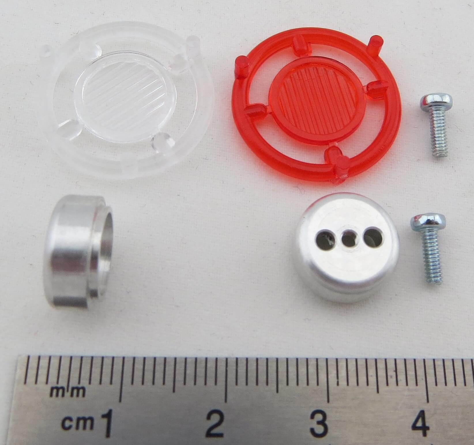 Je 1x Nebel- und Rückfahrscheinwerfer, rund mit Lichtscheibe 1x rot, 1x klar. Grundkörper ALU 11mm Durchmesser. Mit Befestigungs-Schraube M2.(500907077). Lieferung erfolgt ohne Leuchtmittel.