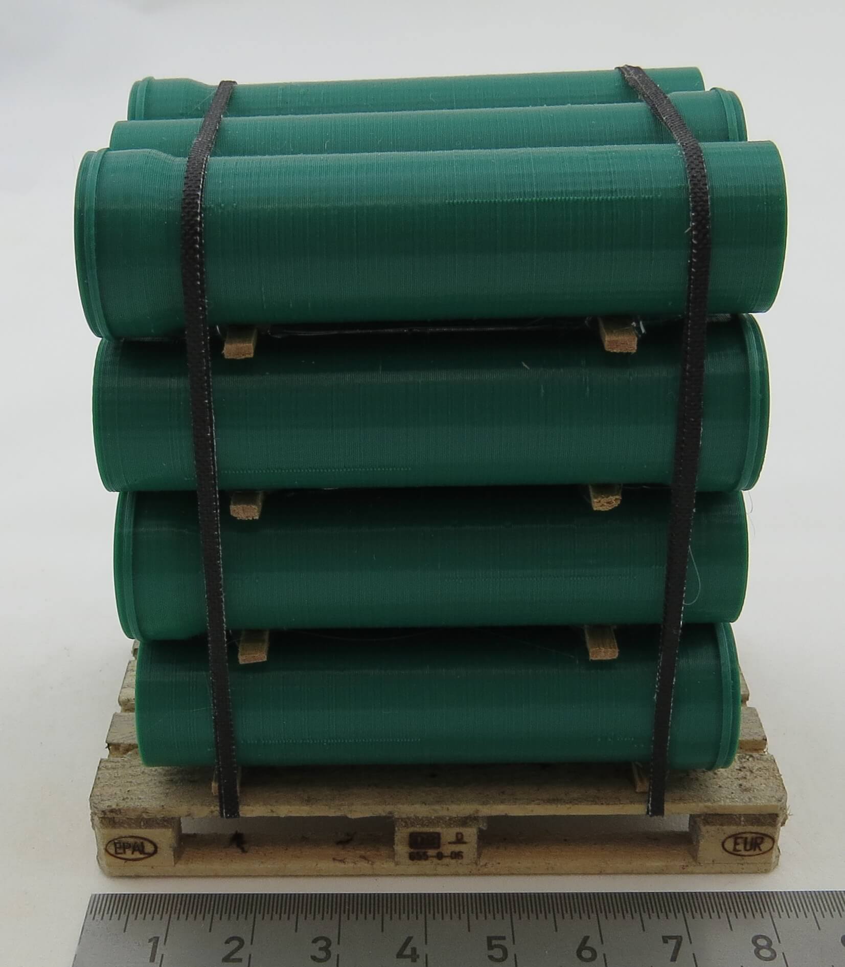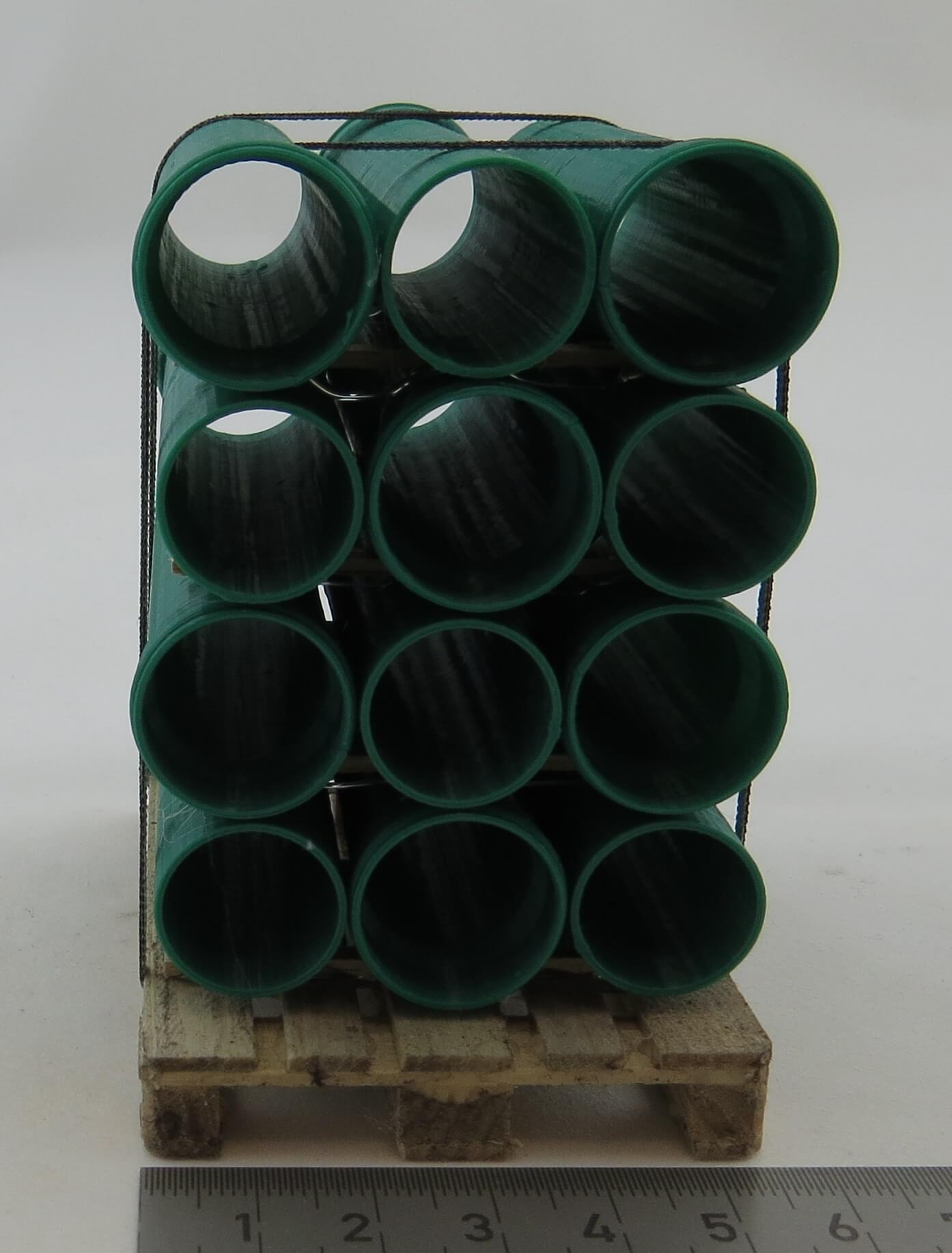 Kanalrohr-Palette im Maßstab 1:14,5. GRÜNE Kanalrohre (3D-Druck). Gestapelt, umreift auf einer Holzpalette mit einge brannten Stempeln - lizensiert. Größe: 83x56x85mm. Gewicht: ca. 48gr.