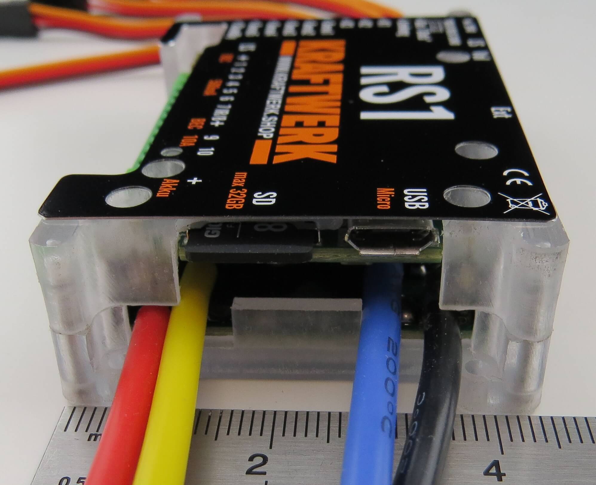 Der RS1 vereint Fahrregler, Soundmodul und Lichtanlage in einem kompakten Modul 6-20V. 25A bis 32kHz Bürsten- und Glockenankermotor.