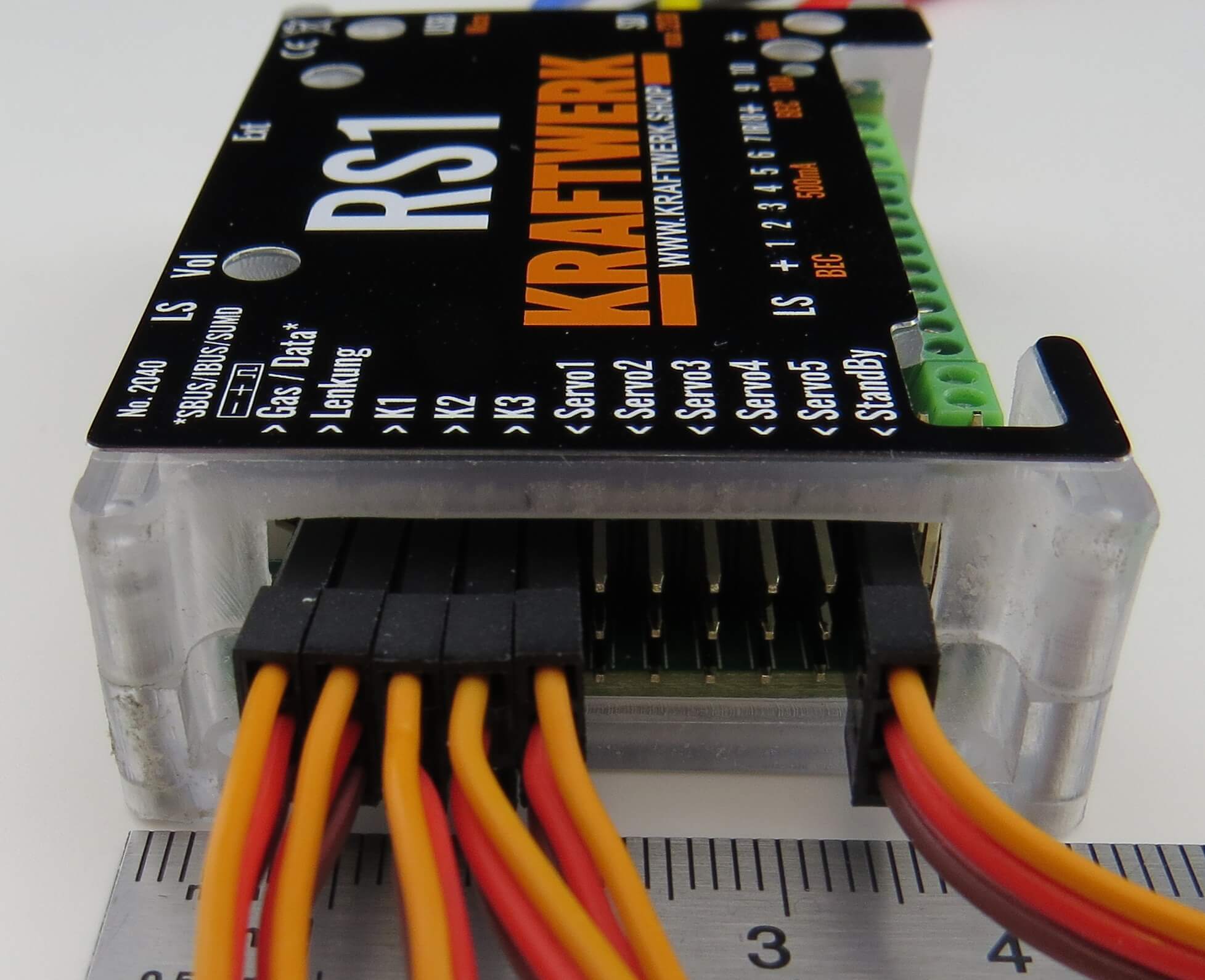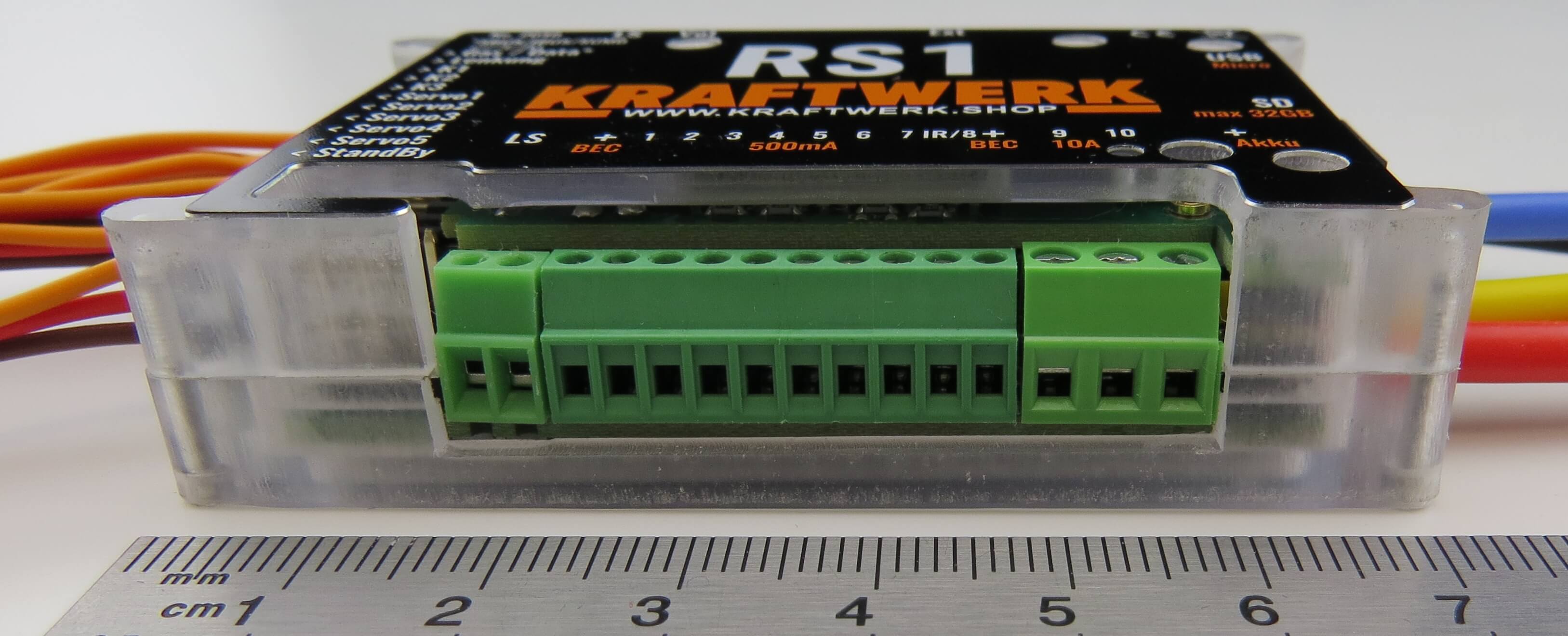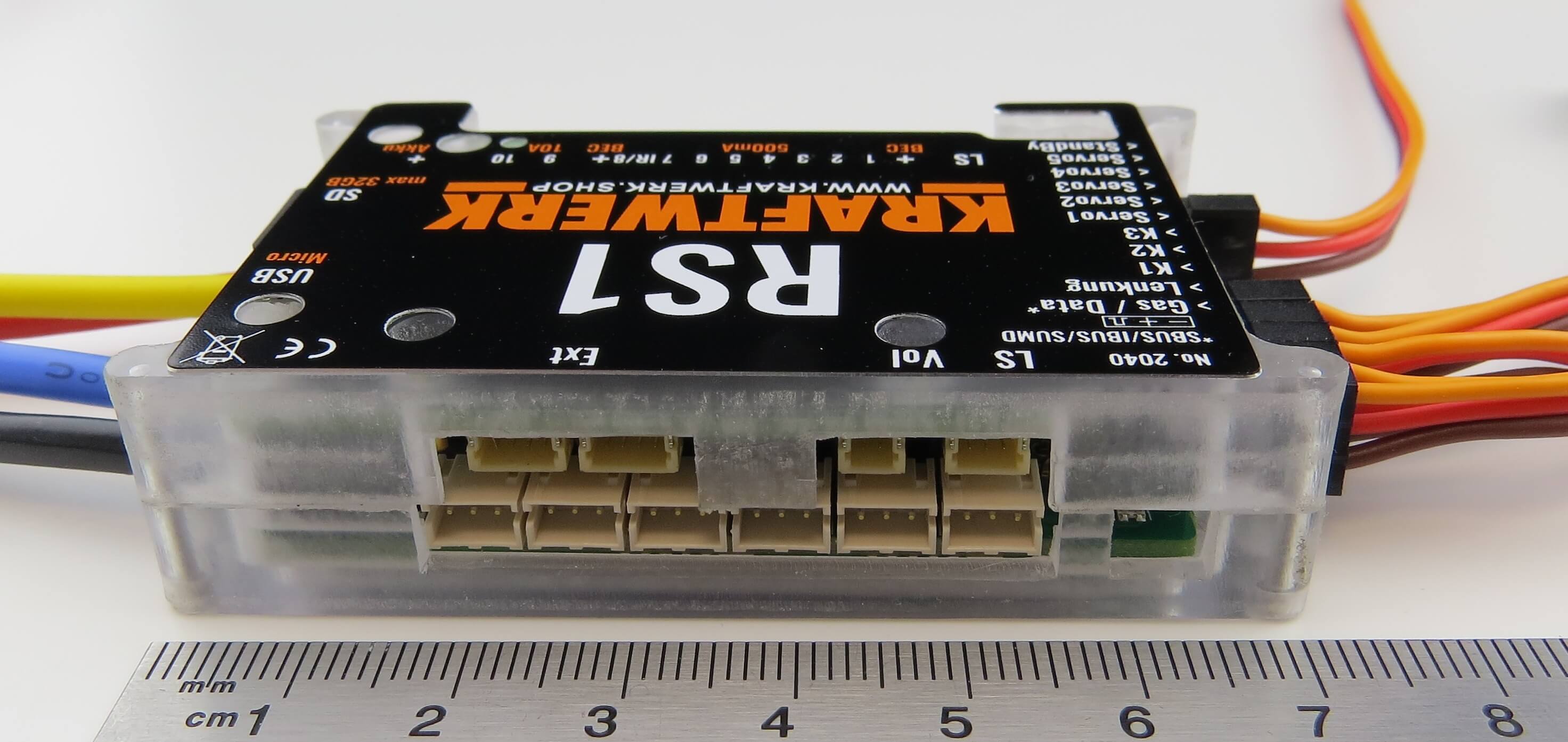 Die führende Rolle von KraftwerK im Bereich RC Bussysteme kommt nun beim RS1 voll zum Tragen. Über die 6 EasyBus Ausgänge kann der RS1 beliebig erweitert werden. Beleuchtungsplatinen, Schalterweiterungen, Servosteuerungen und vieles mehr kann über den EasyBus angesteuert werden. Ein besonderes Gimmick hat der RS1 aber noch: Auf der oberen Seite sind kaum sichtbar vier einzelne Buchsen platziert, über welche ein weiteres Modul aufgesteckt werden kann. Das erste Modul dieser Serie ist der BL8A, ein 8A Brushless Regler gedacht für Hydraulikpumpen.