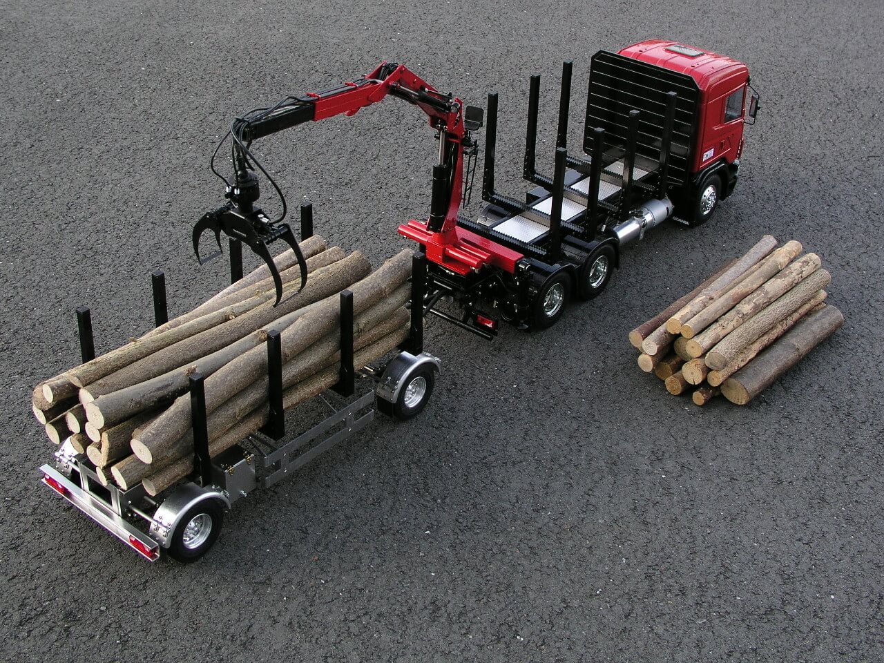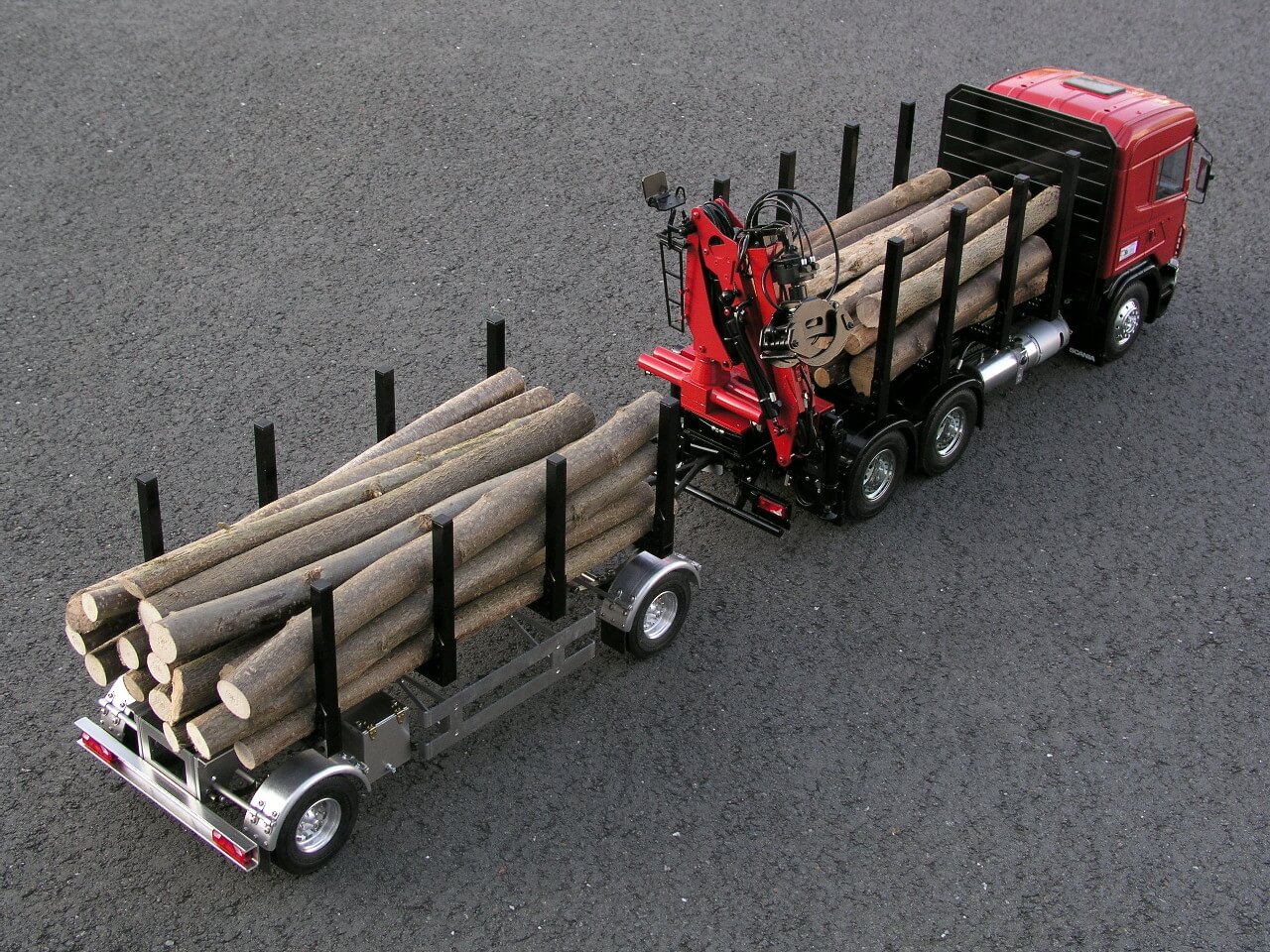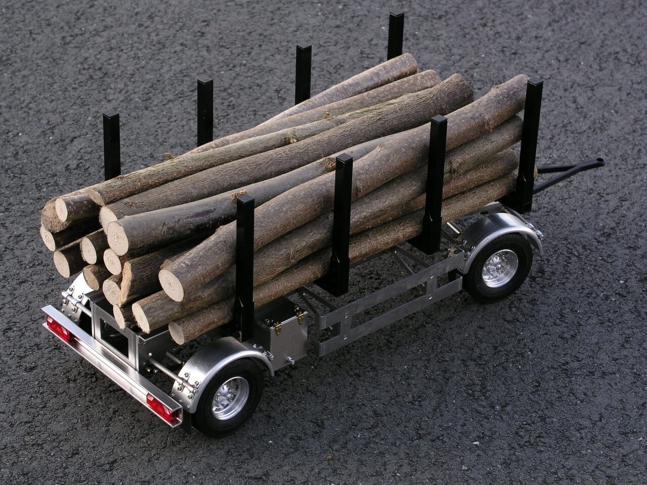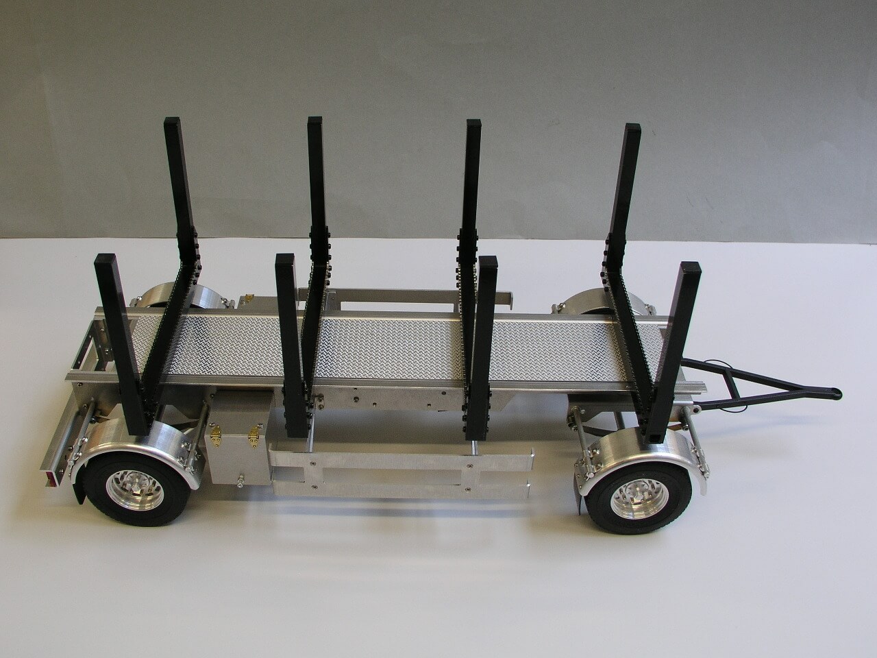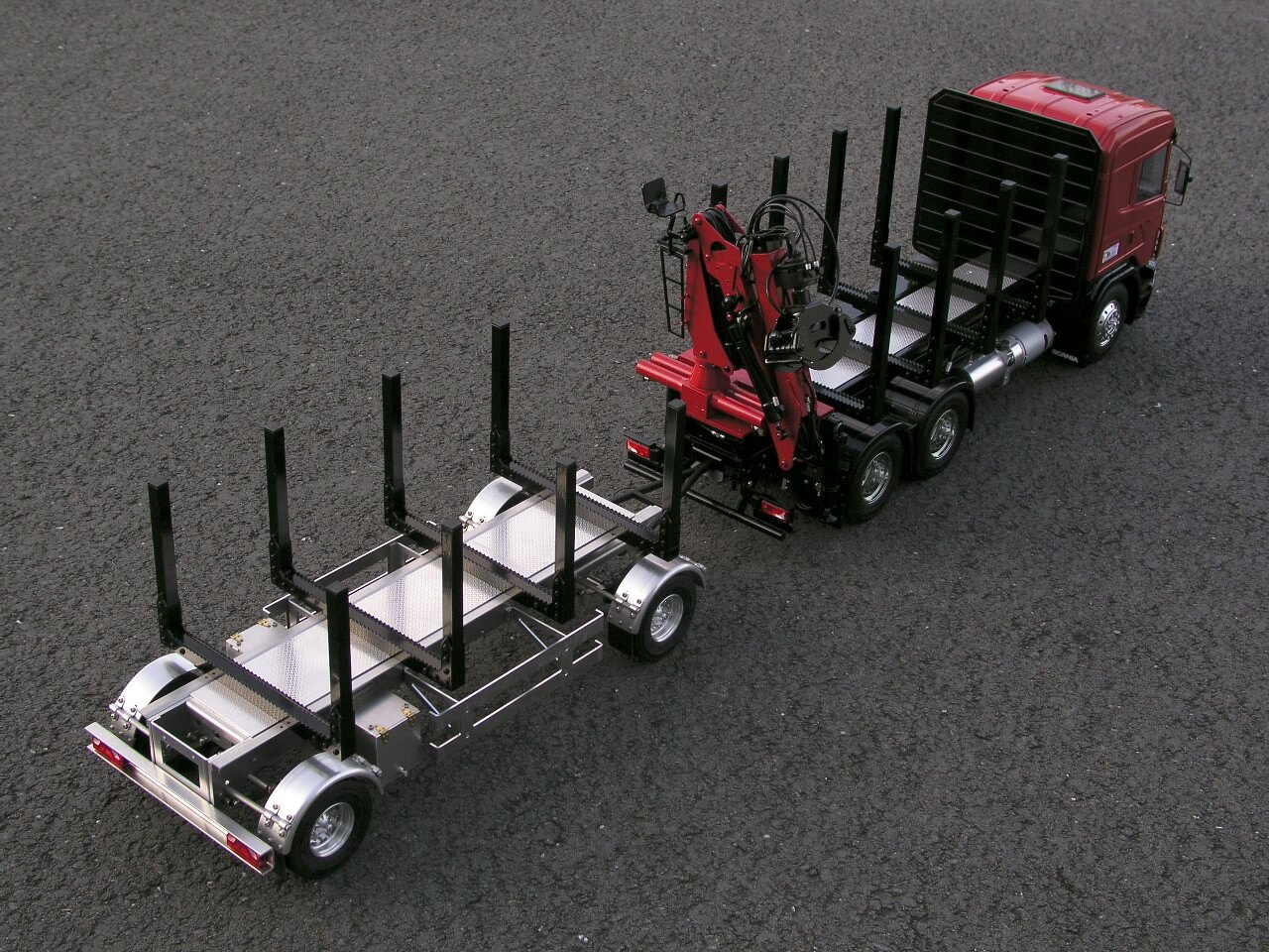 Kurzholzanhänger-Bausatz, Tamiya-Maßstab . Passend zu den Artikeln 12093, 12094. Mit Feststell-Bremse, die über ein Servo betätigt wird. (9409T).