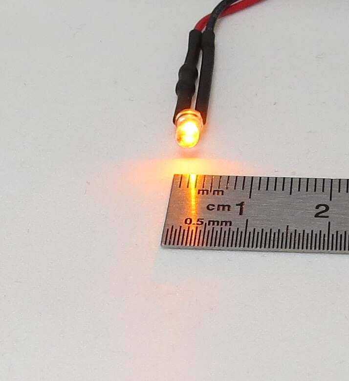 Leuchtfarbe: orange Gehäusefarbe: klar Größe: 3mm Kopfdurchmesser Betriebsspannung: 7,2 - 12V Litzenlänge: ca. 25cm mit Vorwiderstand Abstrahlwinkel: ca. 30° Strom: typ. ca. 20mA