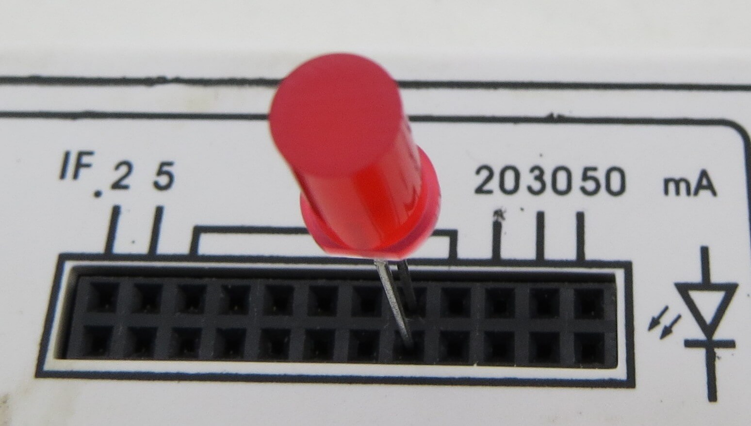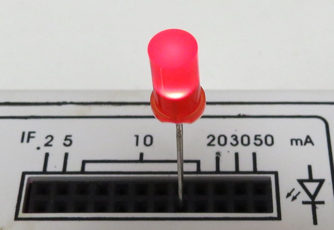 1x LED rot 5mm, zylindrisch, diffuses rotes Gehäuse. 2,3V, max. 18mA. Flacher Kopf. L-483IDT.