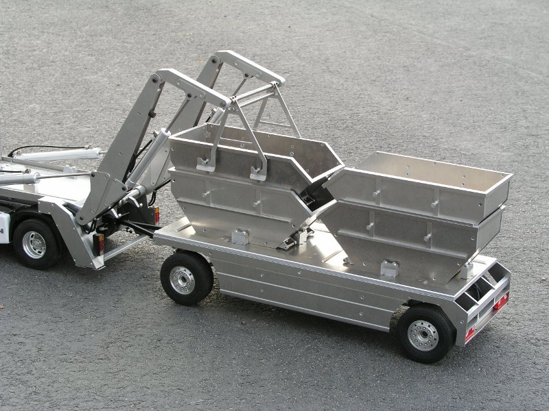 Absetzanhänger-Bausatz, Wedico-Maßstab. Passend zu allen Absetzmulden. Mit Feststell-Bremse, die über ein Servo betätigt wird. (9382) Als Spielwert-Steigerung bietet LEIMBACH ab sofort passend zu unserem Absetzkipper / WELAKI einen Anhänger für Absetzmulden an, um mehrere Mulden transportieren zu können.