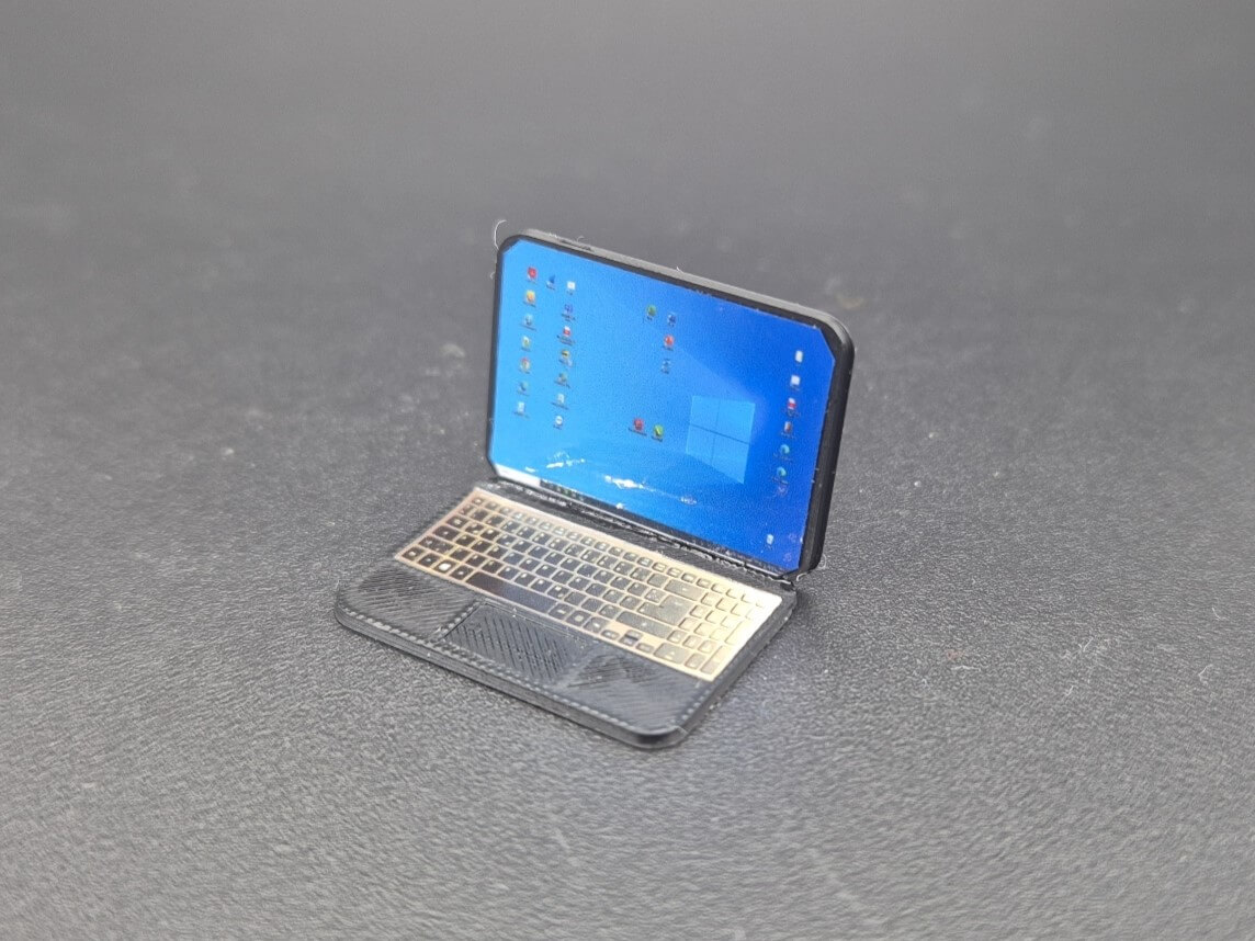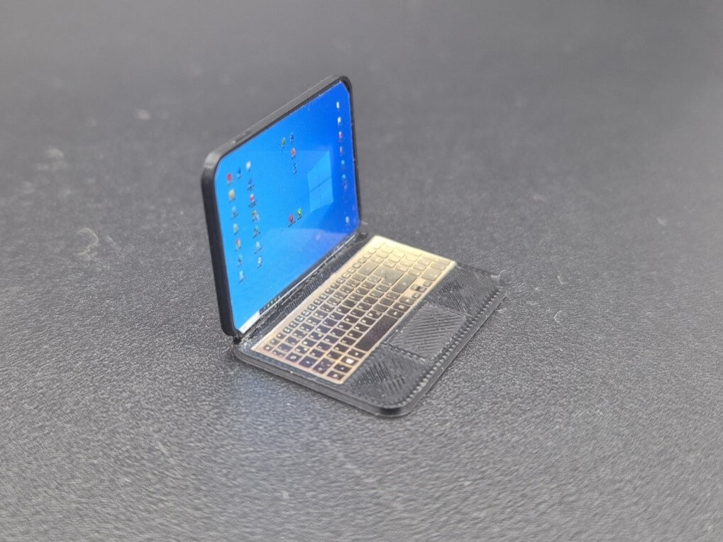 Laptop (Kunststoff), schwarz Bausatz, ca. 24x16 mm Grundfläche. 2mm D Mit aktuellem Windows Aufklener Bildschirm und Tastatur. Angedeutetes Pad. Inkl. 3g Sekundenkleber