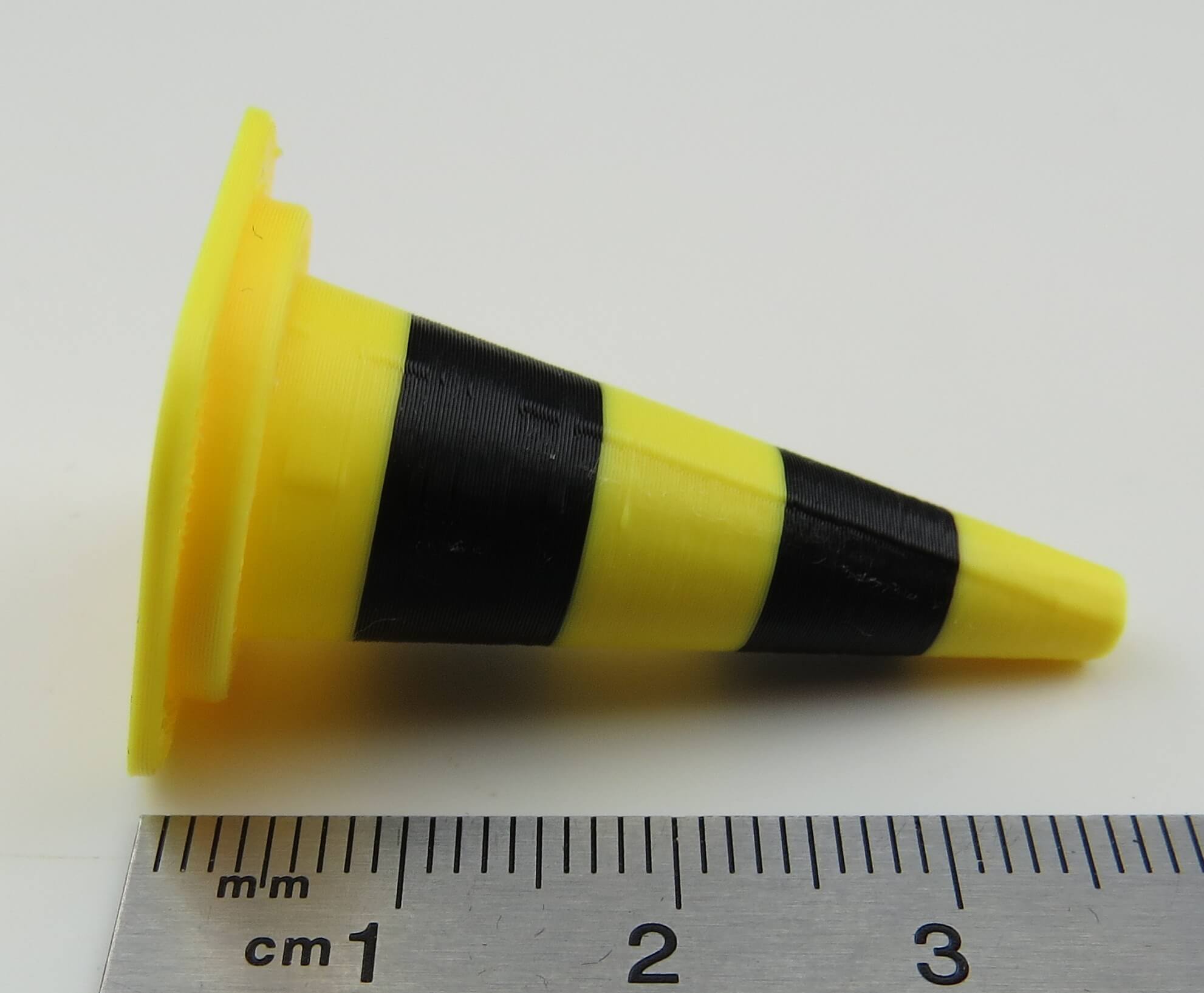 1 Leitkegel (50cm im Original). Tamiya-Maßstab. Höhe: 37mm. Standfläche: 21,5 x 21,5mm. Farbe: gelb/schwarz. Hohlkörper. Gewicht ca. 3gr.