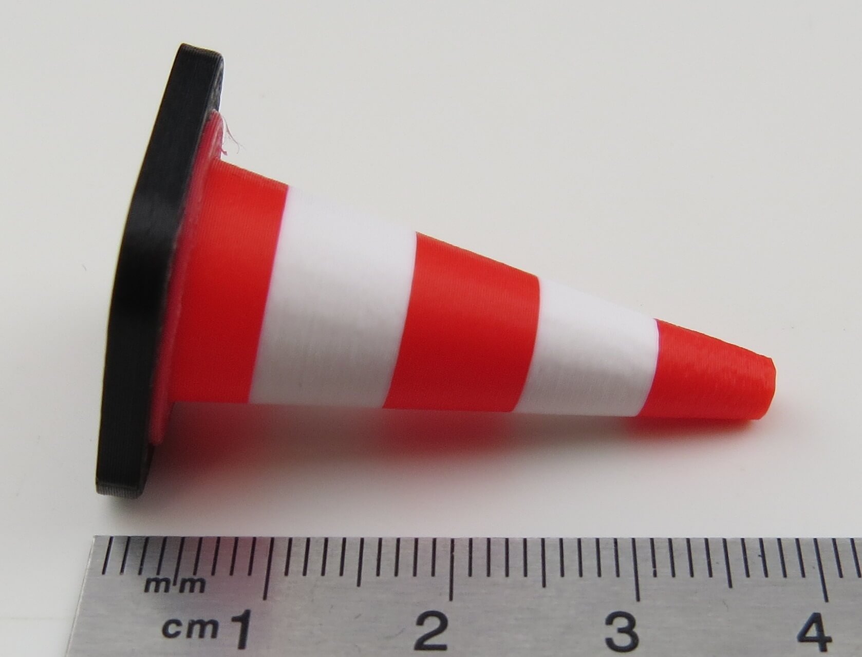 1 Leitkegel (50cm im Original). Tamiya-Maßstab. Höhe: 37mm. Standfläche: 21,5 x 21,5mm. Farbe: rot/weiss/schwarz. Hohlkörper. Gewicht ca. 3gr.