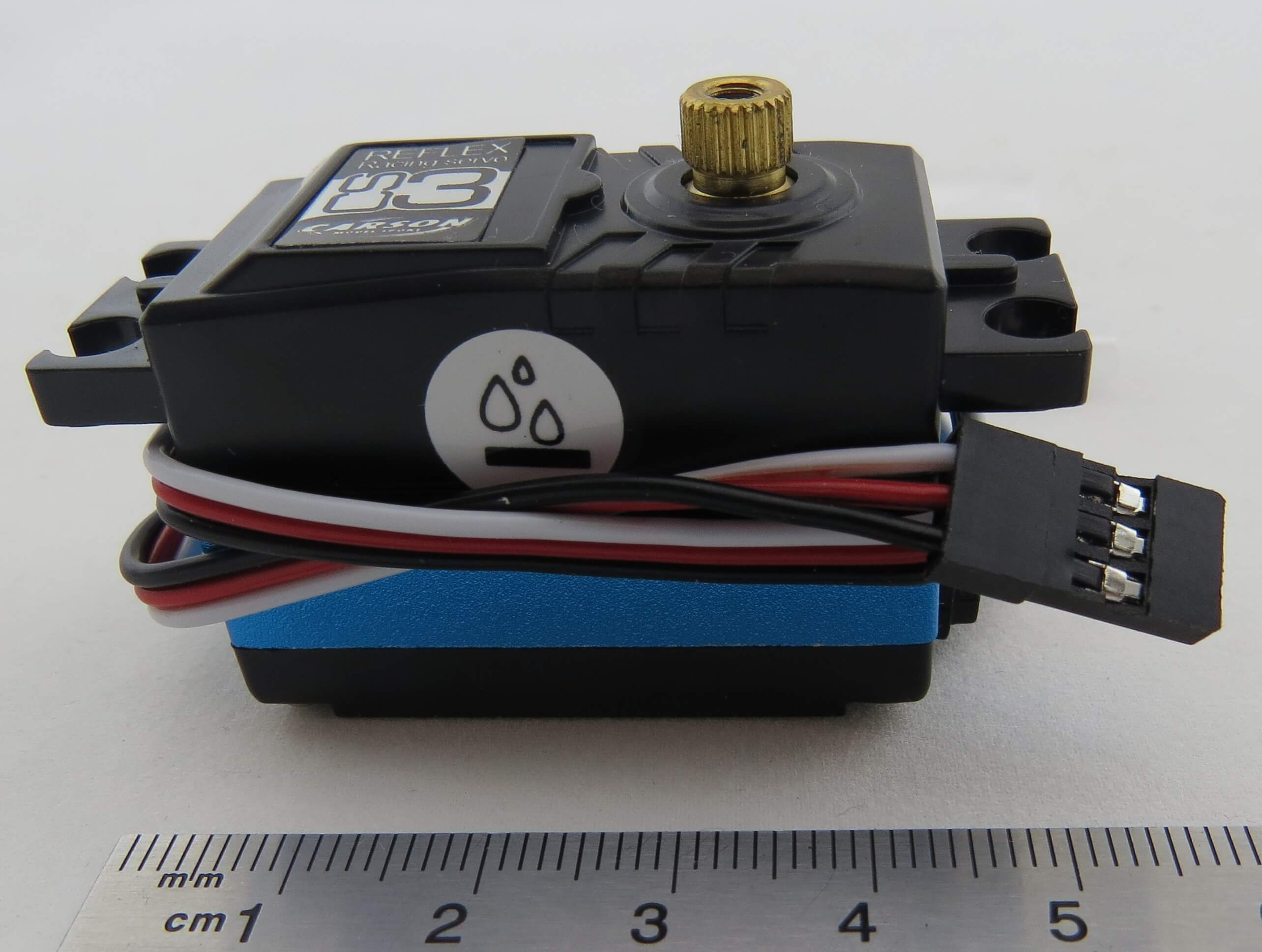 Low-Profile-Servo, waterproof. Spritzwasserdicht.