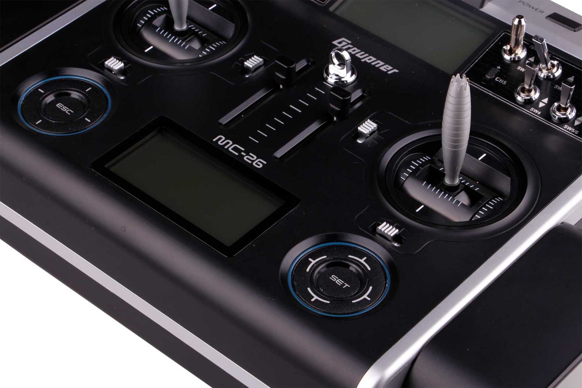Die mc-26 Fernsteuerung verfügt über eine interne circular polarisierte Patchantenne mit sehr hoher Reichweite und Zuverlässigkeit. Zwei große, kontrastreiche Displays informieren jederzeit über Telemetriedaten sowie -parameter und ermöglichen die schnelle und einfache Programmierung.