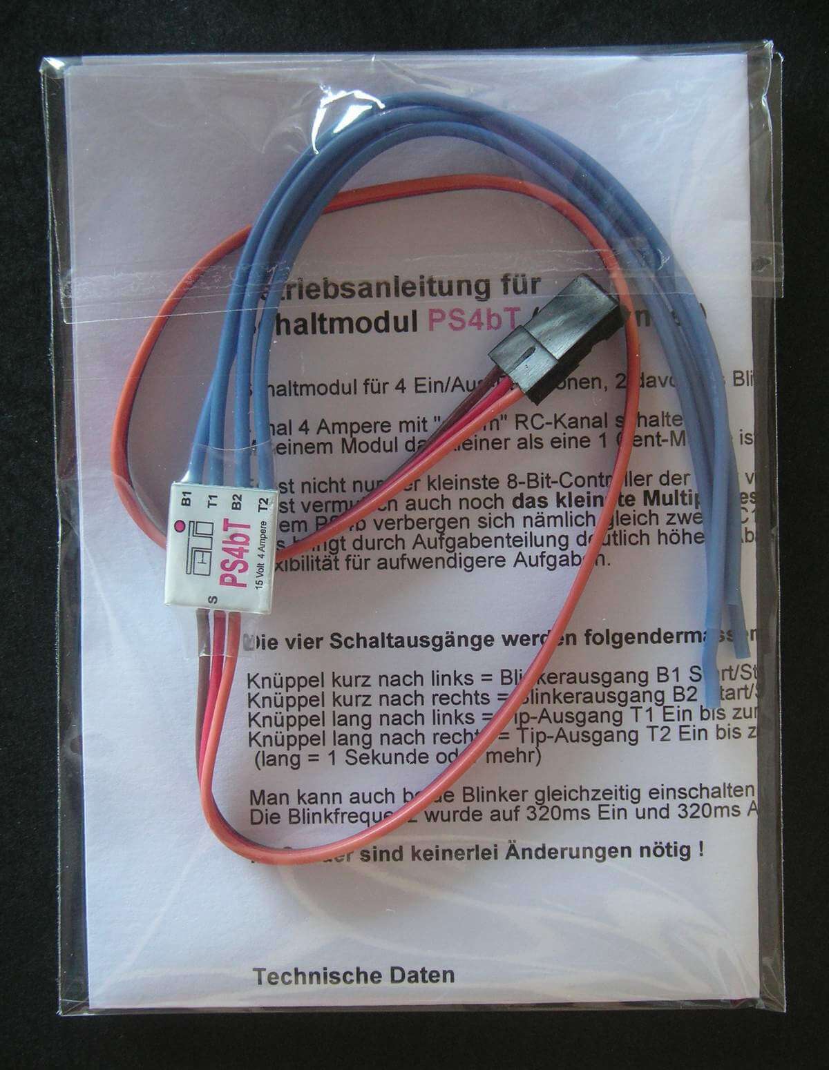 Memoryschalter PS4bT mit 4x 4A-Ausgang 4x Ein/Aus-Funktion auf 1 RC-Kanal 2 Ausgänge als Blinker.2x Tip-Ein-Funkt. 13x15x2,5mm, max. 20 V Spann.CTI-Produkt