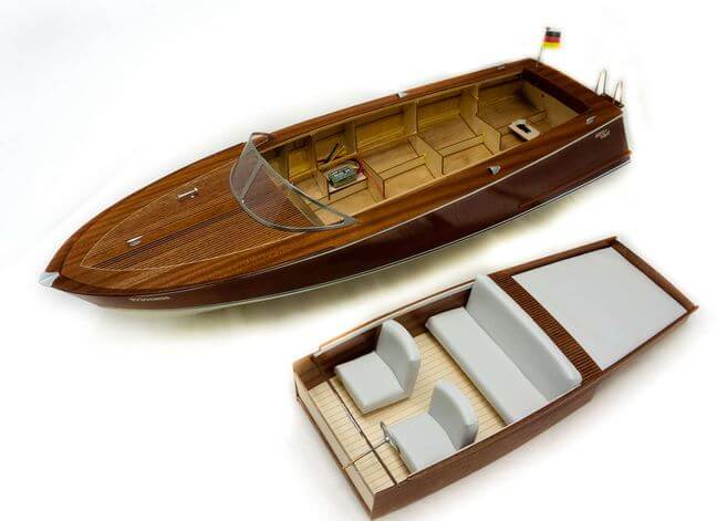 Modellbausatz PRINCESS, Sportboot nach italienischem Vorbild. Ganzholz-Bauweise ca. 1:8. Länge ca. 950mm, Breite ca. 315mm.