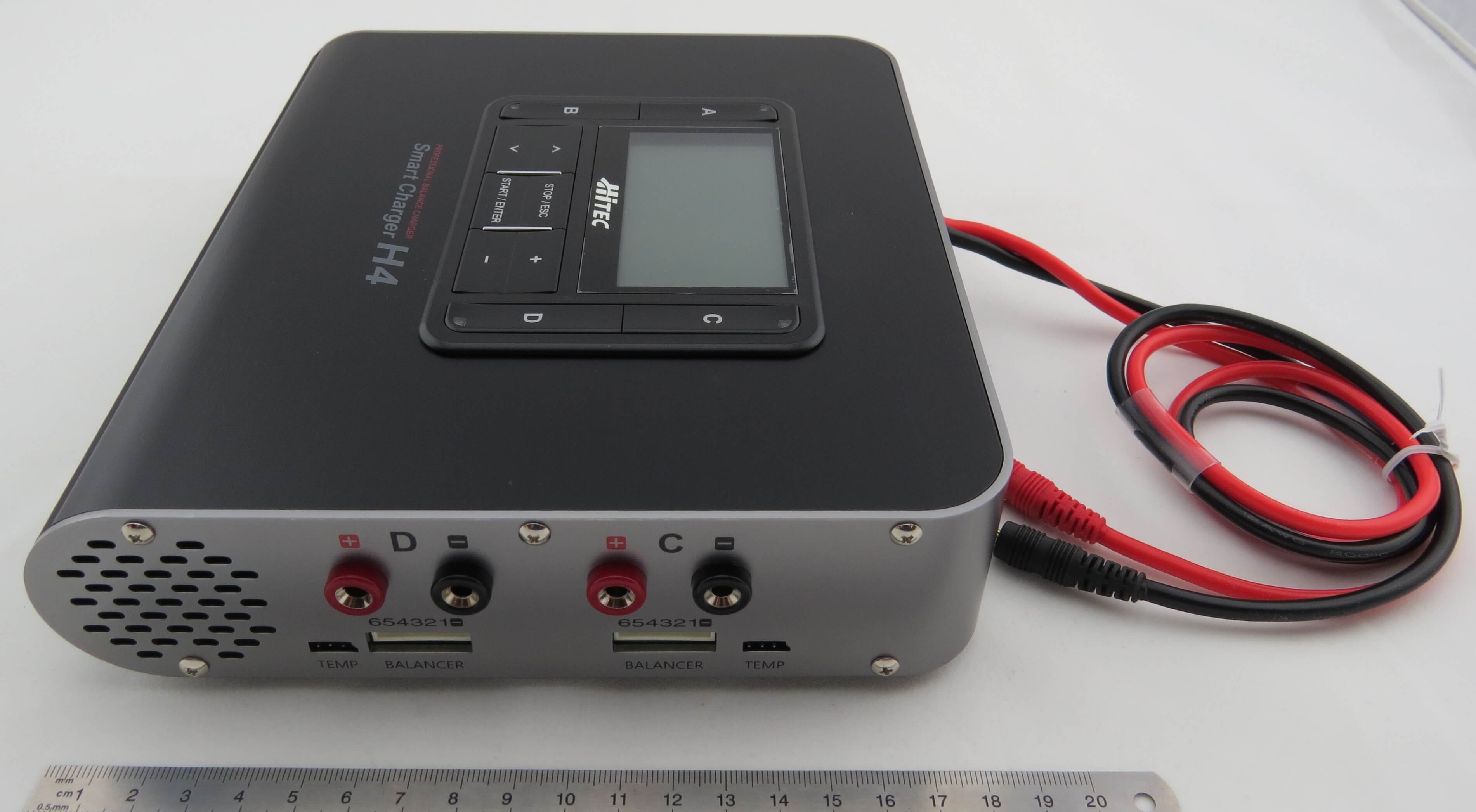 Sein wertiges Aluminium-Gehäuse, das sehr gut lesbare Grafikdisplay, mit intuitiver Bedienung und die 4 mikroprozessorgesteuerten Ladeausgänge mit integrierten Balancern, machen das HiTEC H4 zum perfekten Ladegerät.