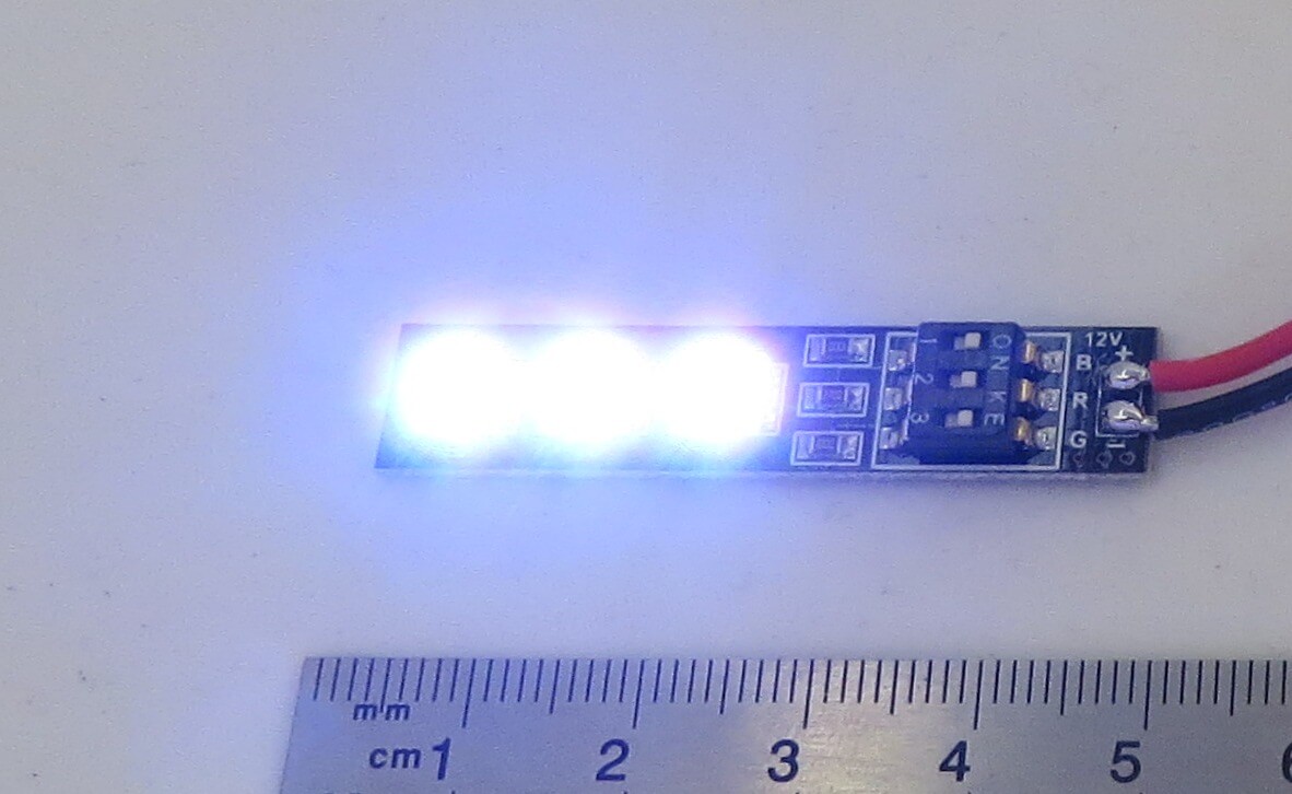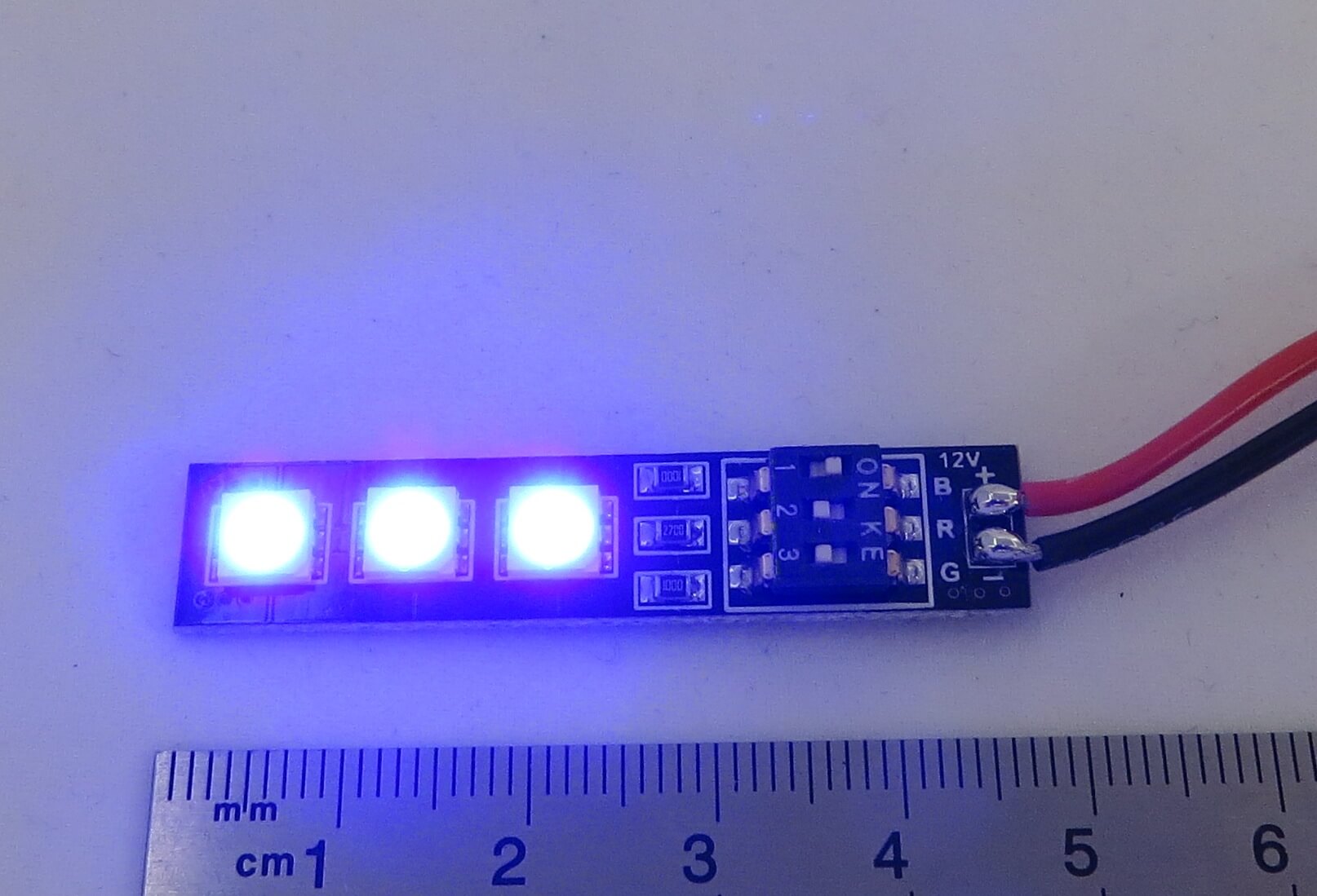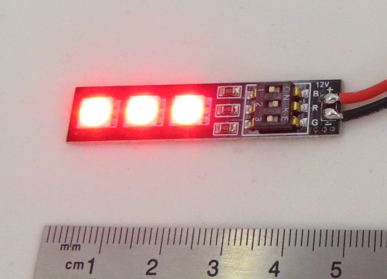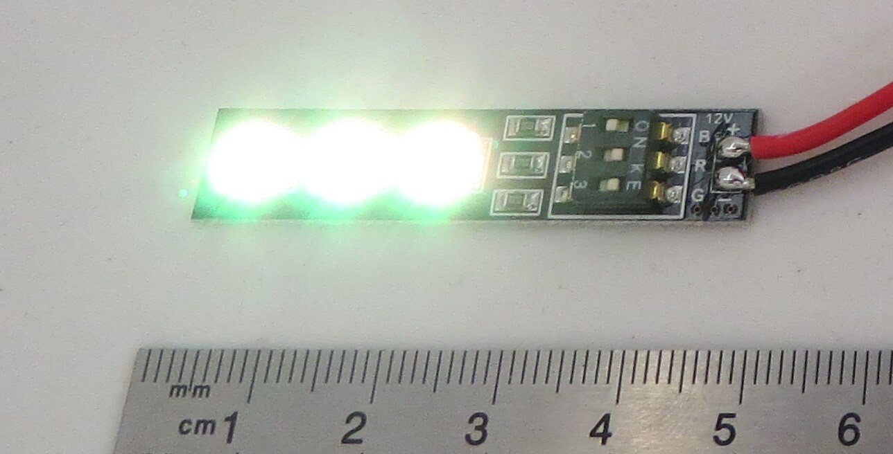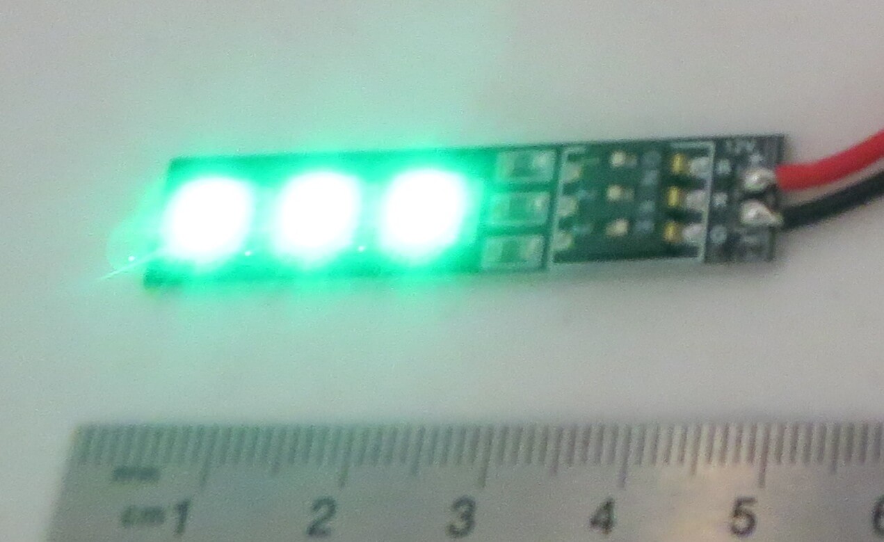 1x Power-LED-Balken RGB 12V. Optische Anzeige des Ladezustandes eines Akkus bis 10-Zellen (NiMh) oder 3 Lipo- Zellen. 3 Power-LED (3-farbig) zeigen per Helligkeit den Ladezustand an.