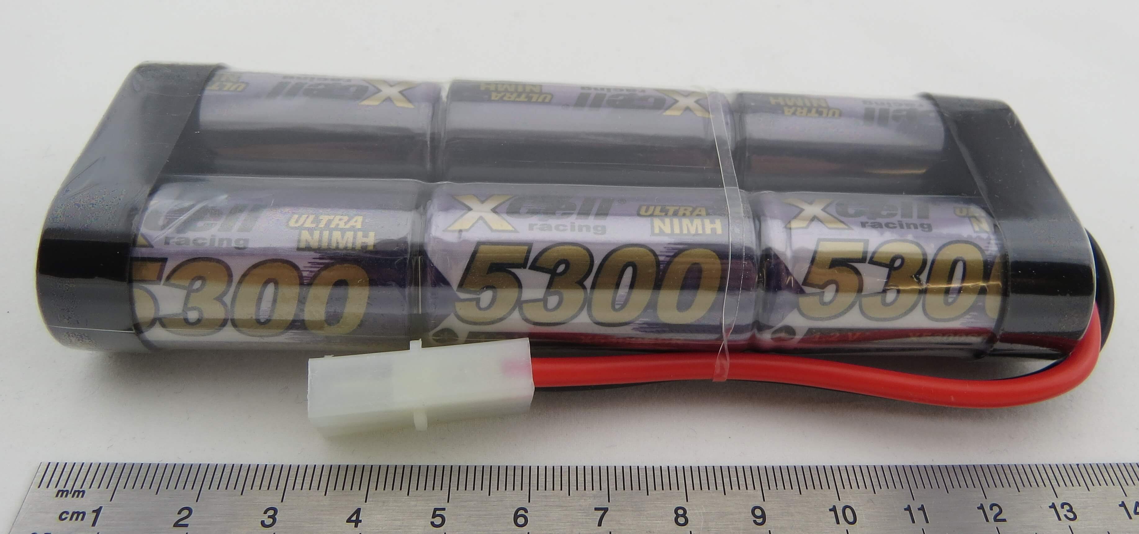 1x Racing-Akku-Pack mit SUB-C-Zellen, 7,2V 6 Zellen, 5300mAh mit Tamiya-Steck. SUB-C-Zellen. Maße ca. 137x47x25mm. ca.450 gr., NiMH, Bauweise L2x3. Mit Silikon-Litzen!