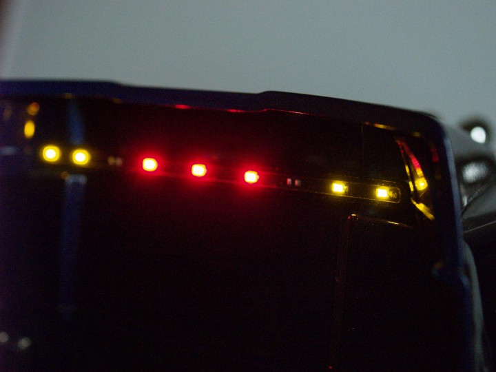 1x Rückleuchtbalken einfach. Dachleucht- Balken für alle Fahrerhäuser mit 7 LEDs. Je 2x LED gelb (außen) für Blinker, 3x LEDs rot für Rücklicht/Bremslicht.