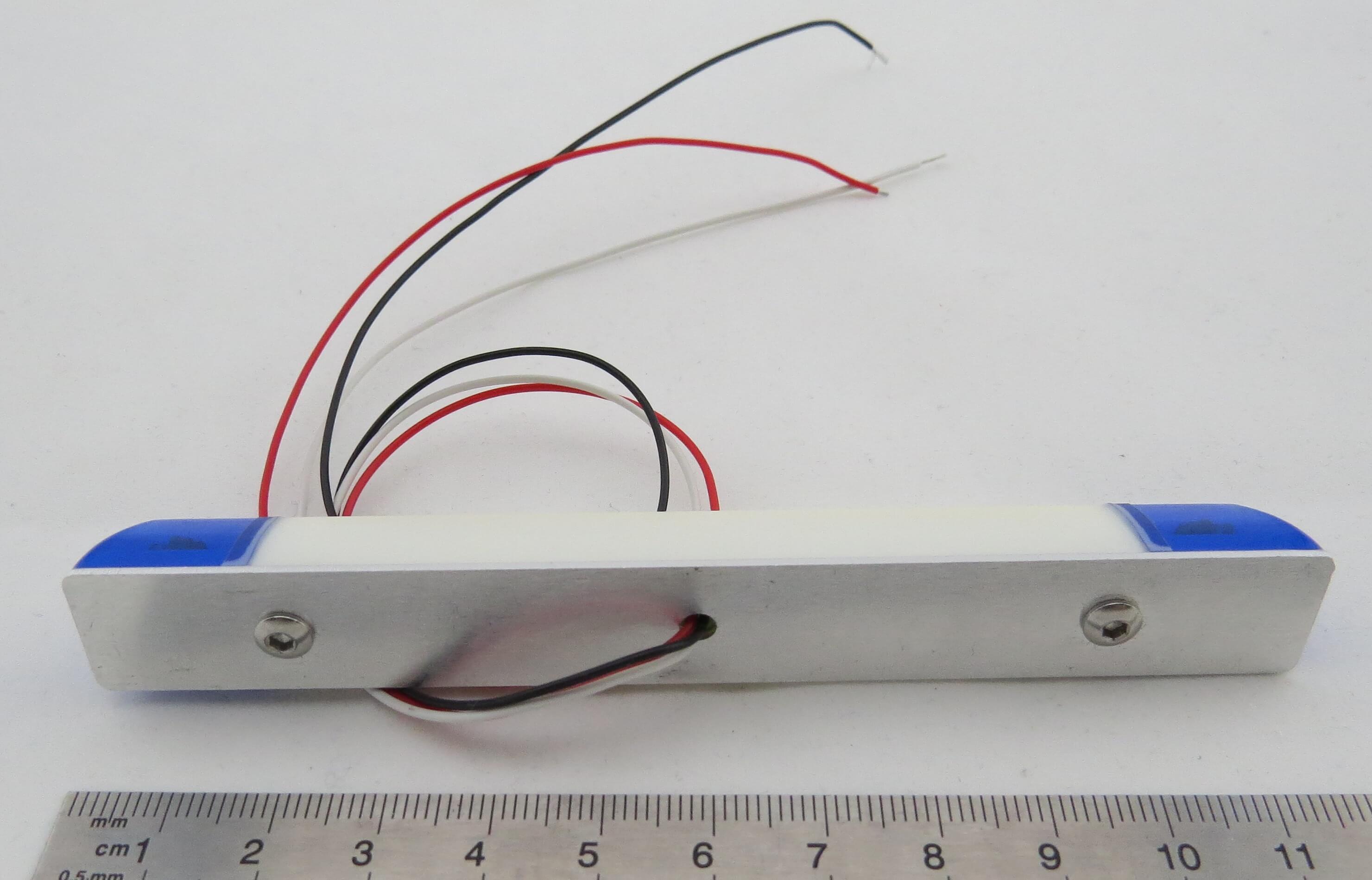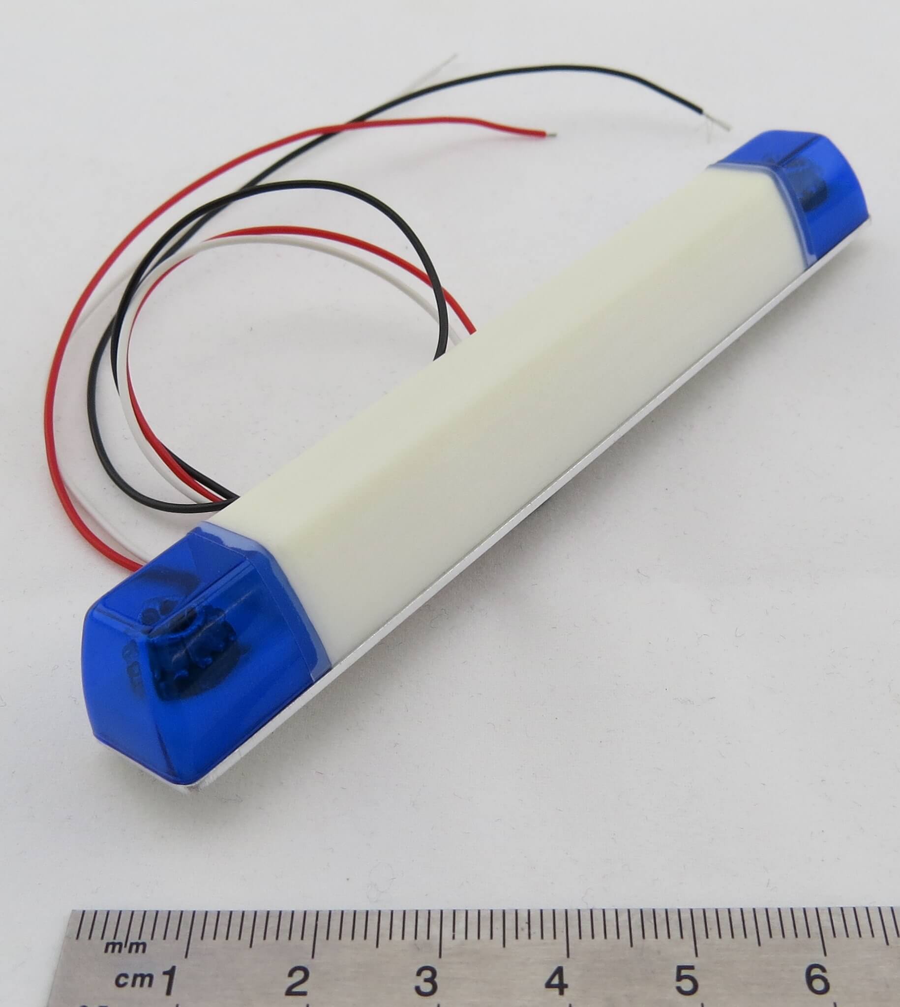 Rundumleuchtbalken, mit integrierter Elektronik u.SMD-LEDs, BLAU, 4-12V, eckige Abdeckhaube, Maßstab passend zu Wedico und Tamiya. 3-Draht-Anschluß, H=14mm, B=15mm, L=117mm. 2-fach-lang.