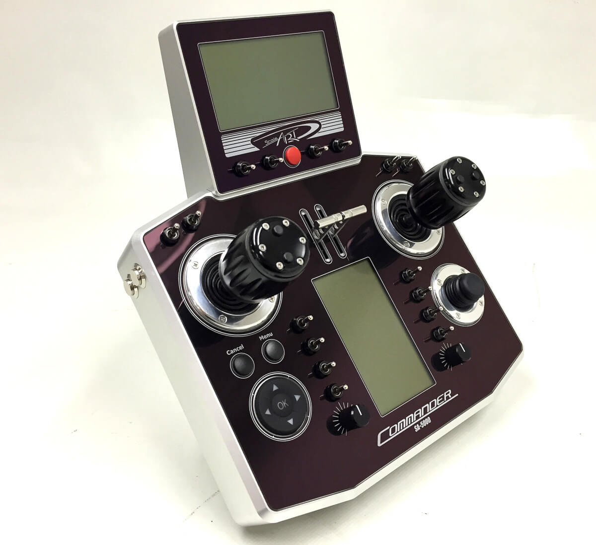 Der große Sender, die SA-5000 ist als Pultgerät ausgelegt, sie bietet in der Standardversion 8 Proportional- und 14 Schaltfunktionen. Je nach Ausstattungsvariante sind bis zu 14 Proportional und 20 Schaltkanäle möglich! In den zwei großen Displays werden die aktuellen Belegungen und Zustände der Bedienelemente angezeigt, sodass auch bei komplexen stets eine übersichtliche Bedienung gegeben ist. Standardmäßig ist sie mit 3D-Knüppeln, Twin-Sticks und einem drittem Joystick ausgestattet. Sie besitzt einen Steckplatz für SD-Karten, dieser dient erstens zur Datensicherung und zweitens für Software-Updates. Updates der Empfänger erfolgen -drahtlos- ebenfalls über diesen Weg.