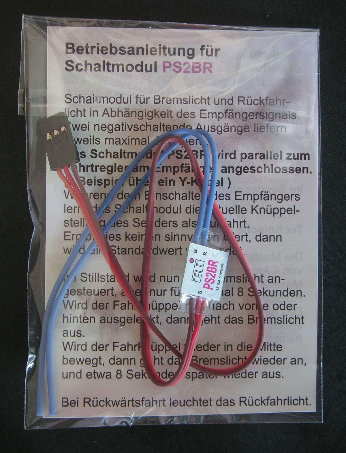 Schaltmodul für Brems- und Rückfahrlicht 2 Ausgänge mit max. 4 A, zum parallelen Anschluß an einen Fahrregler. PS2BR, 13x15x2,5mm, CTI-Produkt.