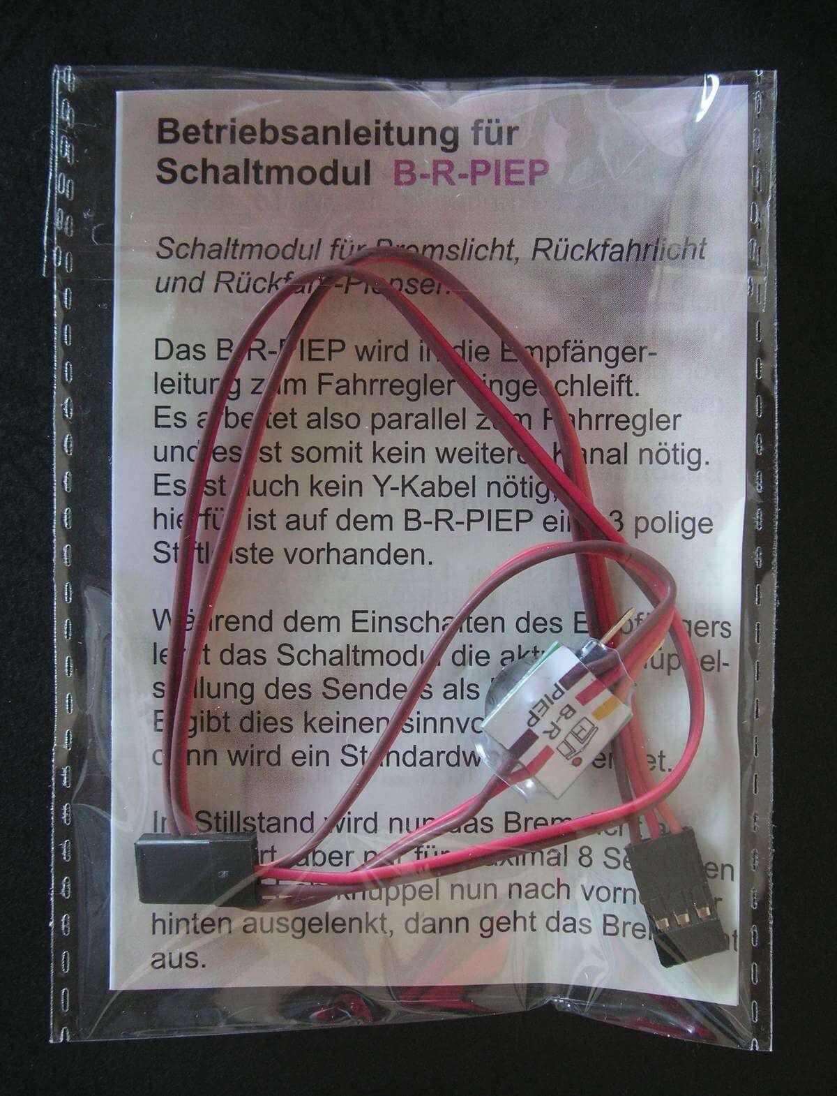 Schaltmodul für Brems- und Rückfahrlicht mit Rückfahr-Piepser! PS-B-R-Piep. Anschluß durch Einschleifen in das Empfängerkabel des Fahrreglers. CTI.