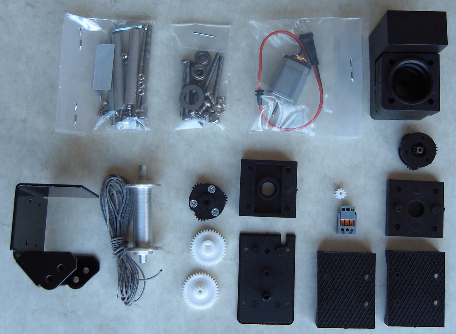 Seilwinde 12V, für Tieflader. Umfang- reicher Bausatz mit Motor, Seiltrommel, Getriebe, Gehäuse, Abdeckung und Klein- teilen. (443).