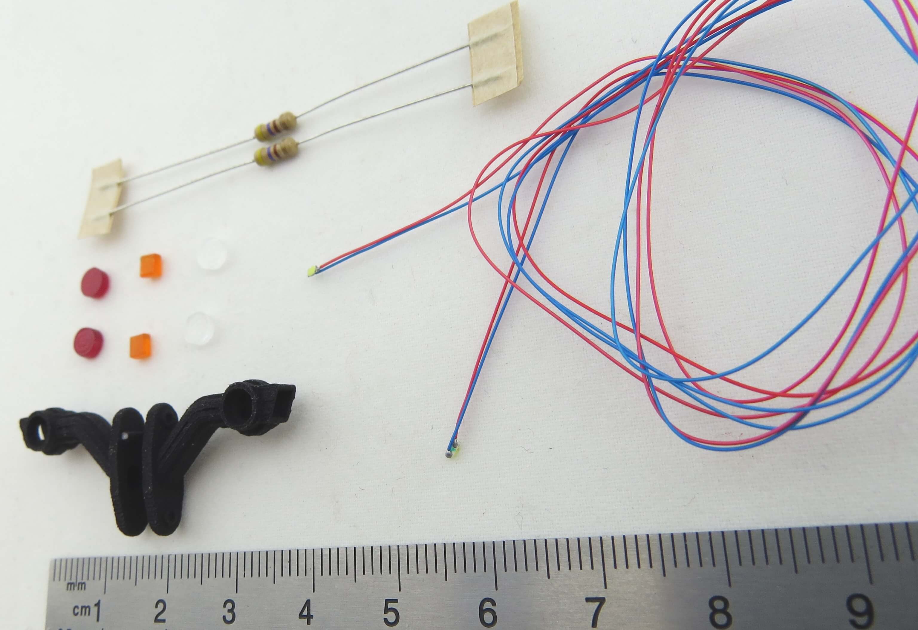 2x Seitenbegrenzungsleuchten, schwarz, ca. 16x18,5mm. 2x Glas, klar. 2x Glas, rot 2x Glas, orange 2x SMD-LED 0603, weiß, mit angelöteten Litzen 2x Widerstand 470 Ohm für 7,2V Schrauben, Muttern und U-Scheiben