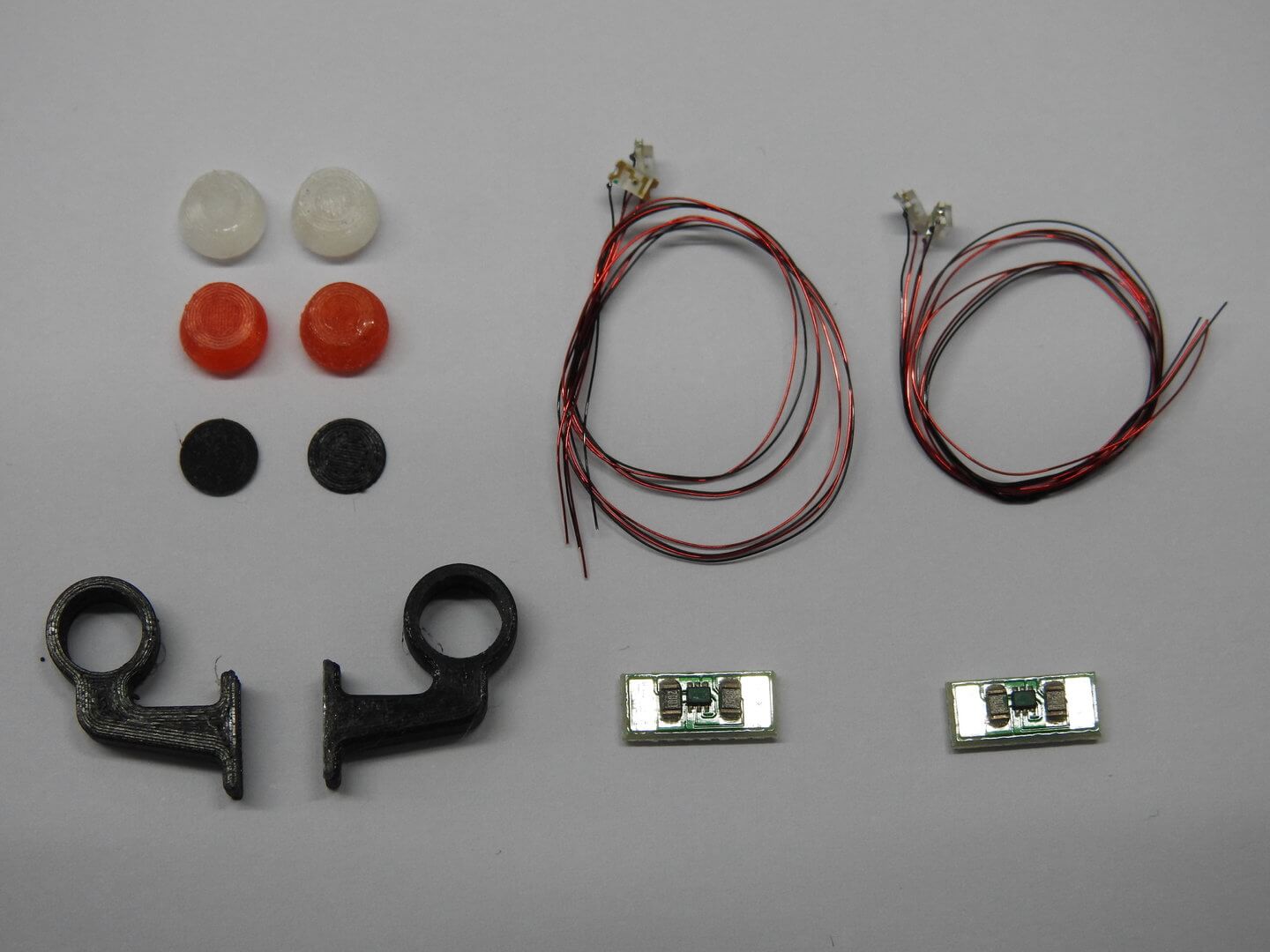 2x Seitenbegrenzungsleuchte Scan-Design Variante2 90° kurz 2x Rote Lichtscheibe 2x Weiße Lichtscheibe 2x Einlage 2x Weiße LED, 2x Rote LED, fertig verlötet mit 0,15mm dünnen und isoliertem Kupferlackdraht. 1x Miniatur Konstantstromquelle 5mA für die Weißen LED's 1x Miniatur Konstantstromquelle 10mA für die Roten LED's 1x Anleitung zum anschließen der LED's Spannungsbereich zwischen 4V und 24V Die LED's müssen noch mit Sekundenkleber von hinten in die Lichtscheiben eingeklebt werden.
