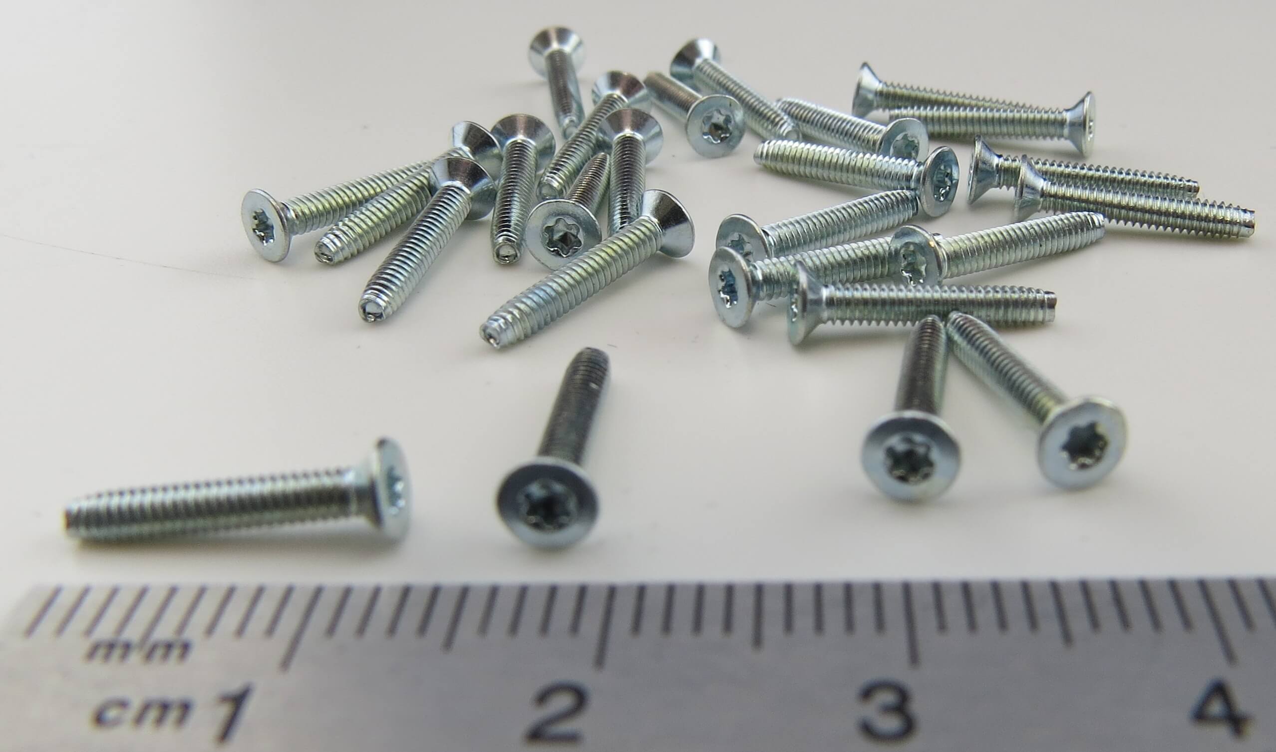 25 Senkkopfschrauben mit TORX-Sechskant DIN 7991, Stahl, verzinkt. TX06. M2x12mm. Kopfdurchmesser 3,8mm. 25 Stück