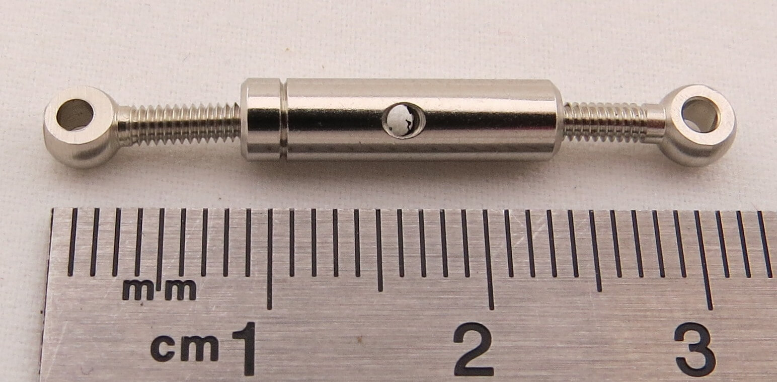 Spannschloss M2 (Alu), mit gegenläufige Gewinde. Gesamtlänge 19 - 30mm. (Mitte- Auge) 1 Stück. Ösen-Durchmesser: Innen 1,7mm, außen 4mm. Durchmesser Grundkörper: 4mm.