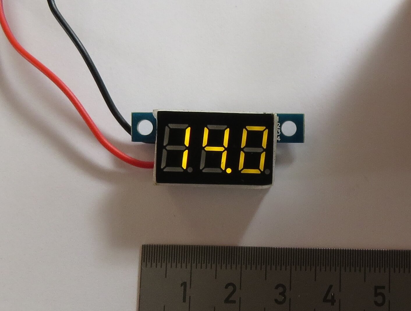 1 Spannungsanzeige für Bereich 3,5-24V. 3-stellige Digitalanzeige mit 7-Segment LED. Genauigkeit 1%. Stromverbrauch weniger als 20mA. Leuchtfarbe: gelb. Größe: ca. 35x14x10mm.