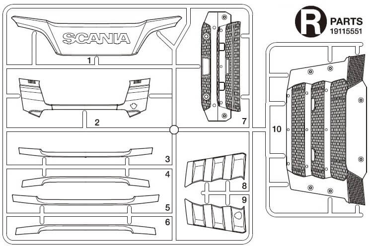 Spritzguss-Teilessatz R-Teile, schwarz Für Scania 770 S (56368) von Tamiya unlackiert. Kühlergrill 319115551
