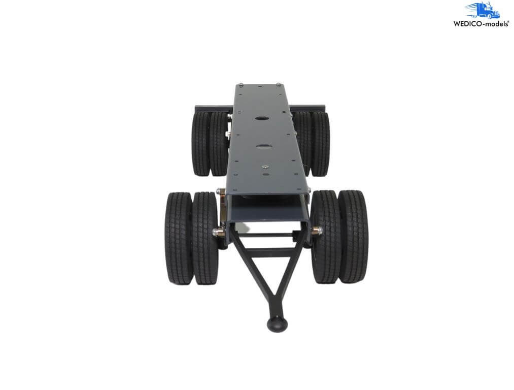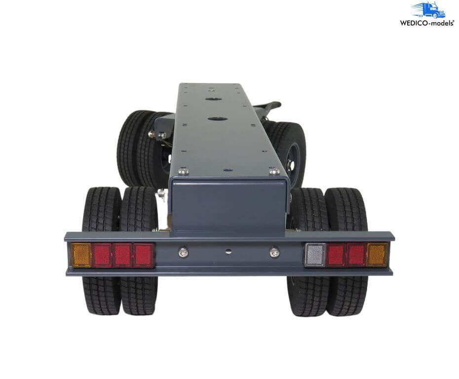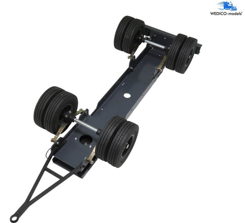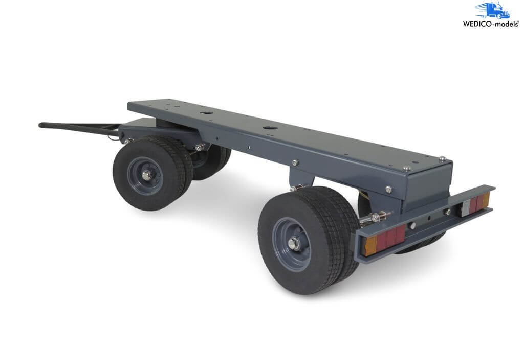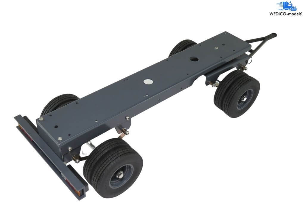 Rahmen, grau pulverbeschichtet Achsträger, grau pulverbeschichtet Drehschemel (grau beschichtet) mit Drehkranz und Deichsel 4-Kammer-Rückleuchten mit Stoßstange (grau beschichtet) Federpakete, Achshalter, Achsen graue Felgen Standard-Reifen (8x), Artikel 4198 Stoßstangenhalter (grau beschichtet)