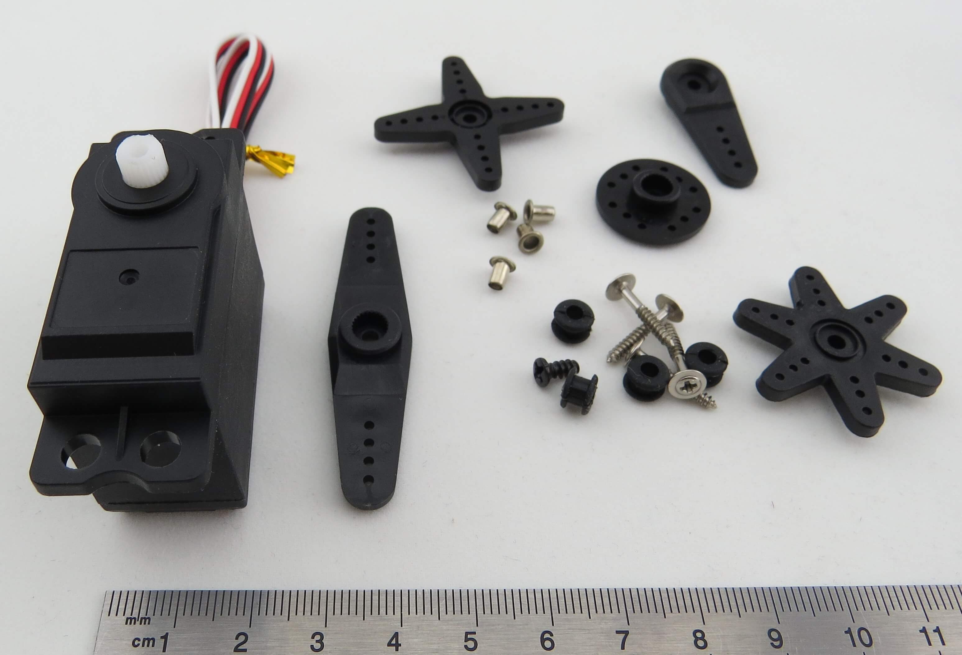 Lieferung mit verschiedenen Servohörner und Befestigungsmaterial.