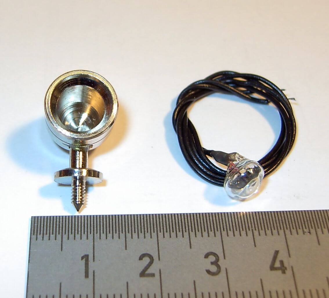 1x Suchscheinwerfer, vernickelt 12mm Durchmesser 3V hell, Höhe gesamt ca. 18mm. Die kelchförmige 3V-Birne bildet gleichzeitig die Lichtscheibe.