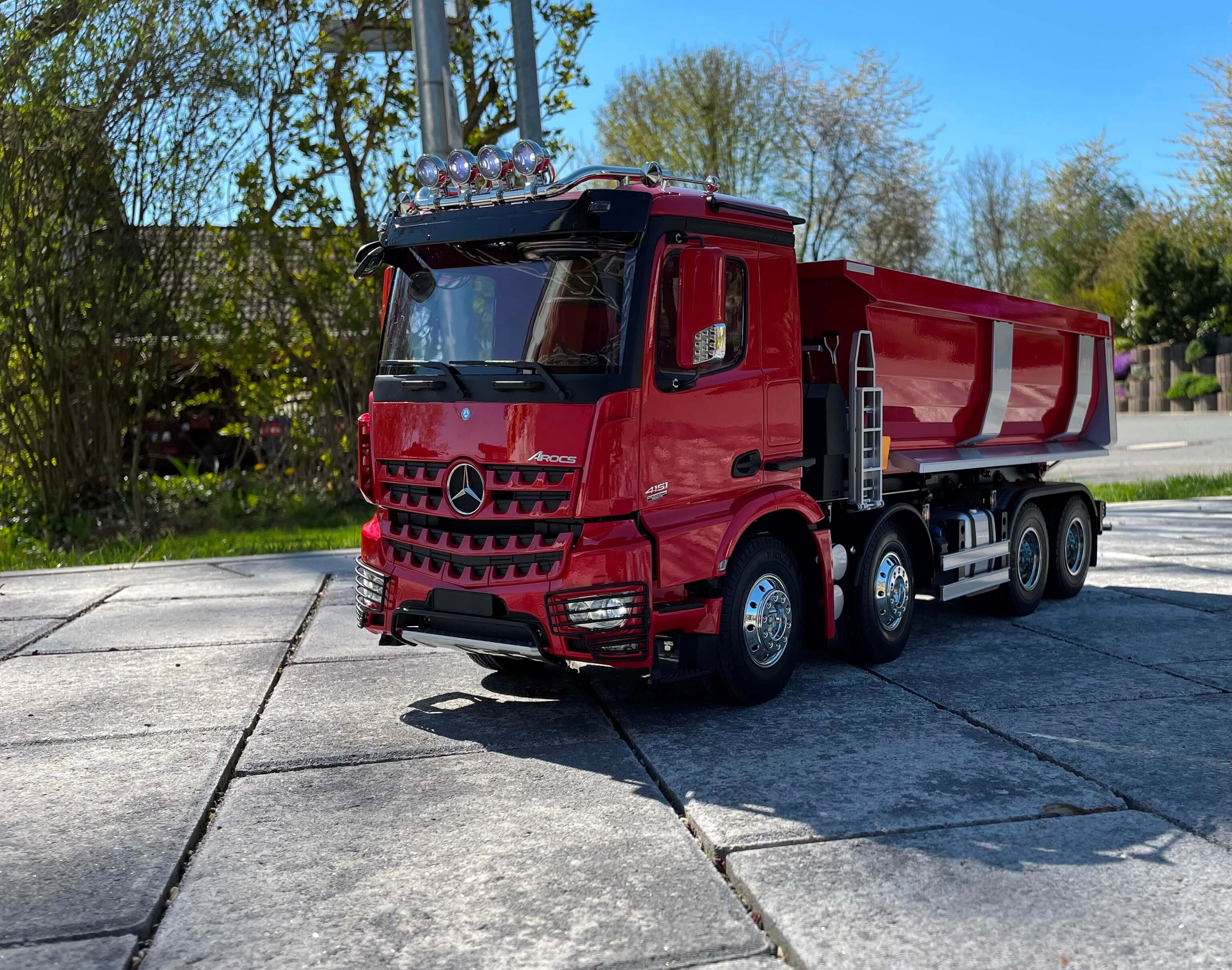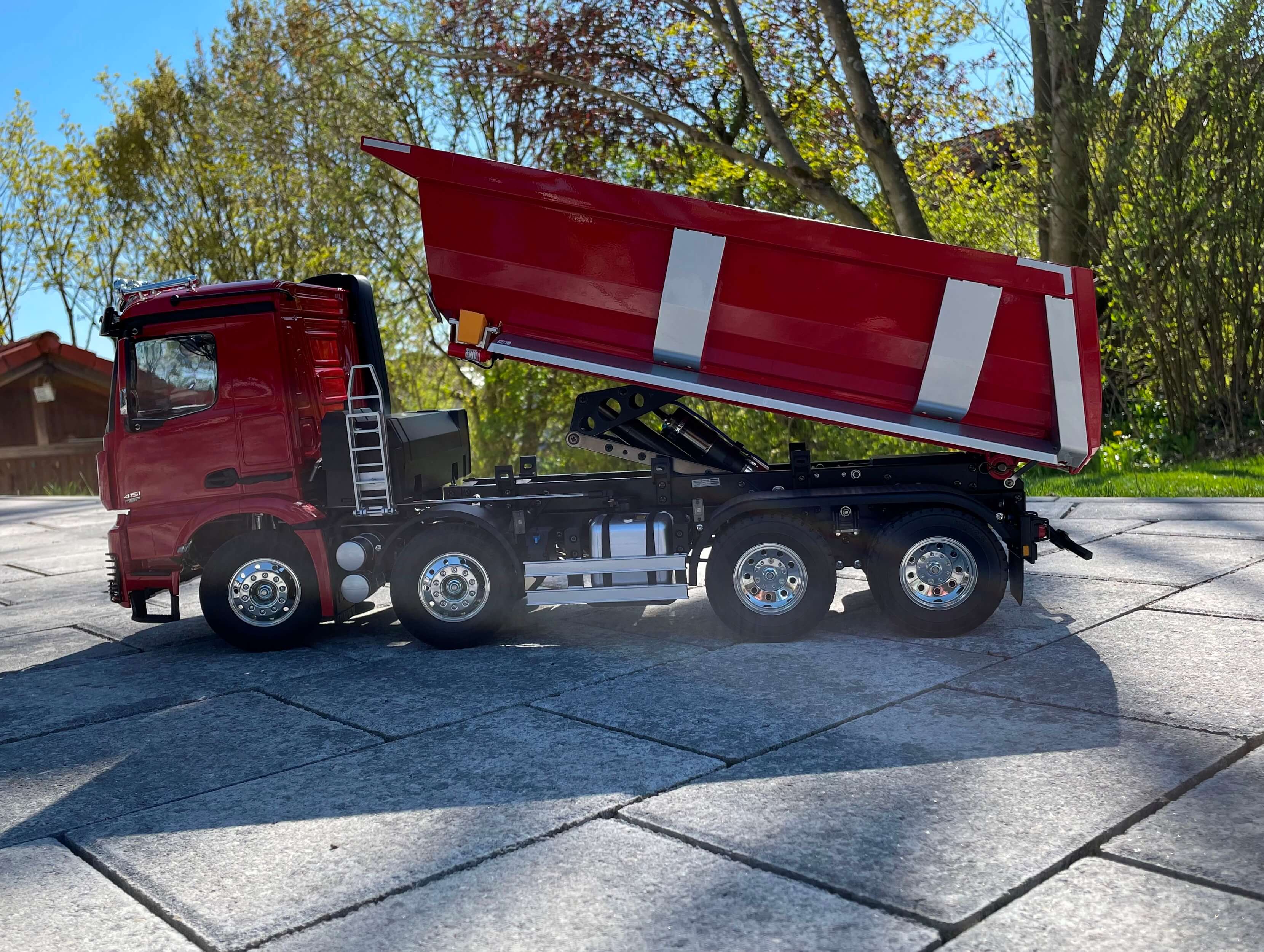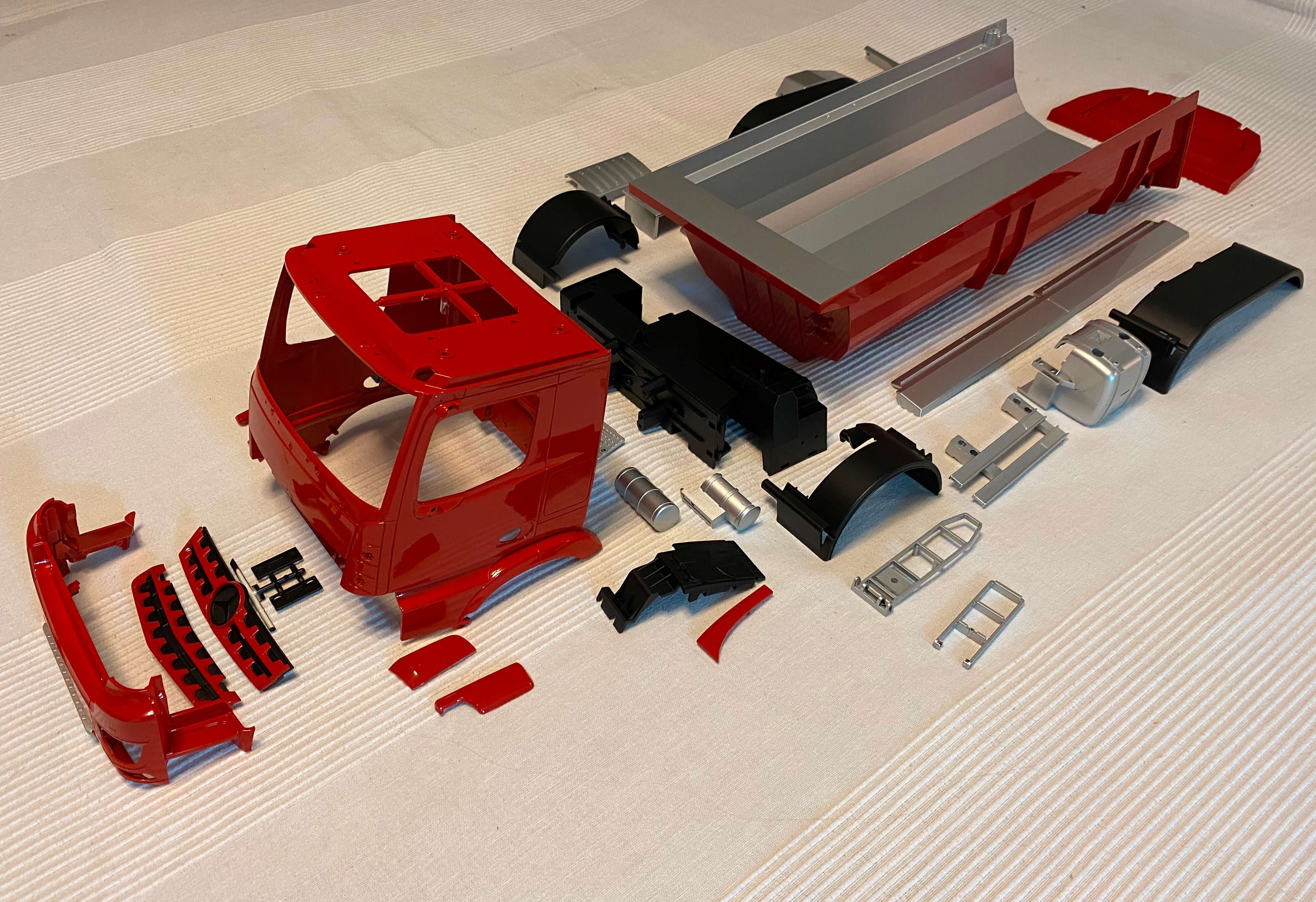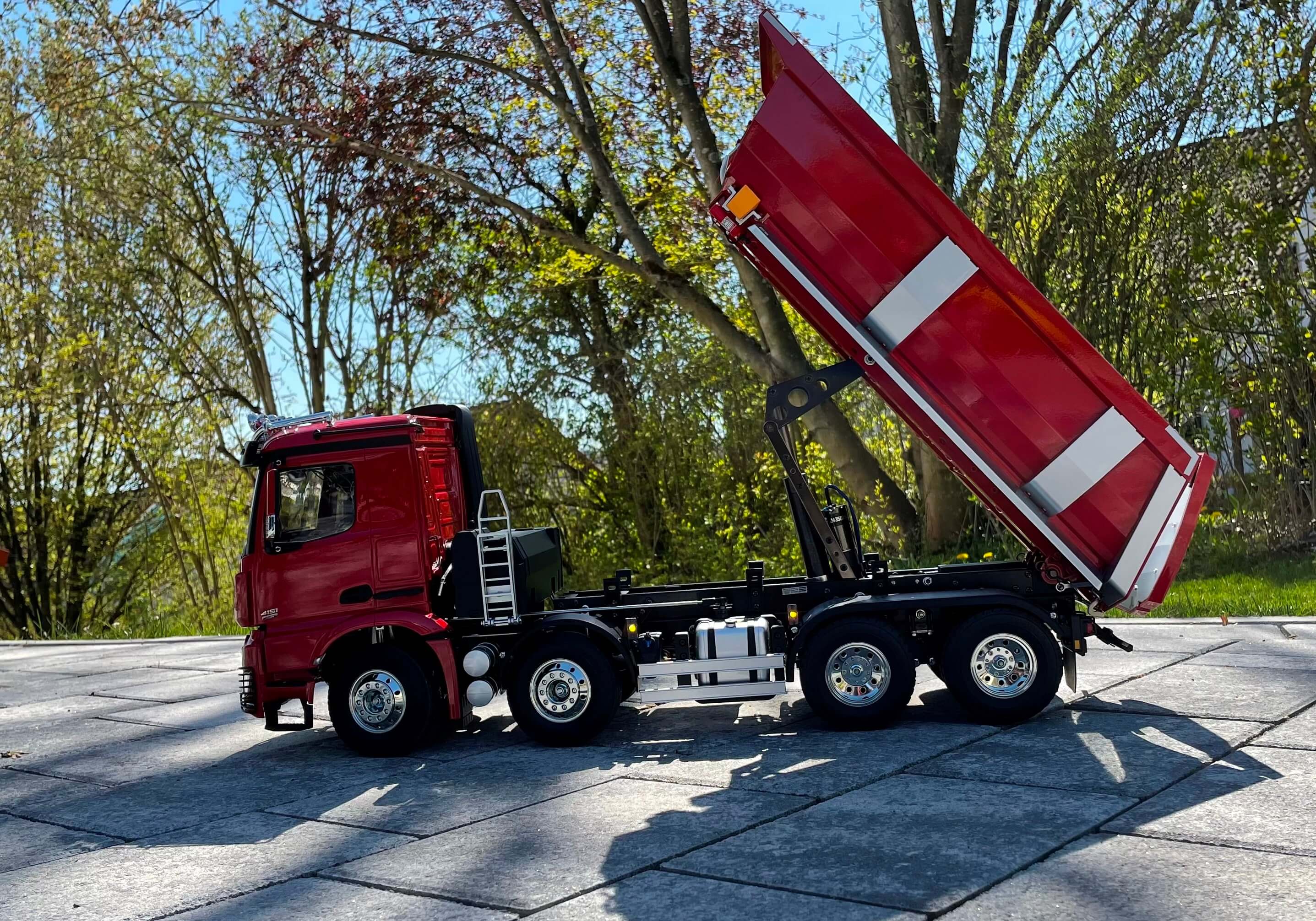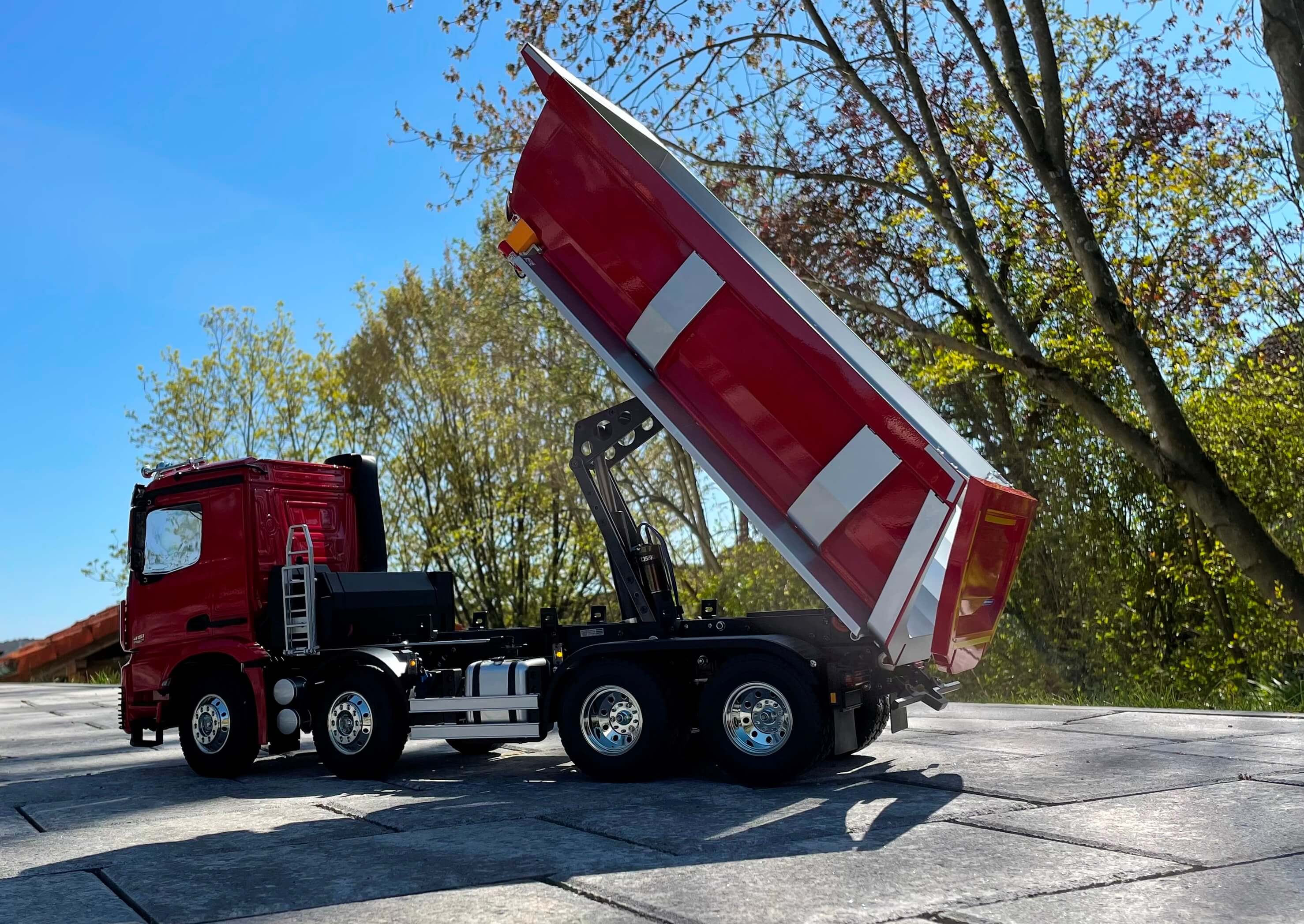 Die Fotos des rot lackierten AROCS zeigen das Ergebnis unseres Lackier-Services. Der Bausatz wird unlackiert geliefert. Die individuelle Lackierung kann optional kostenpflichtig erworben werden.