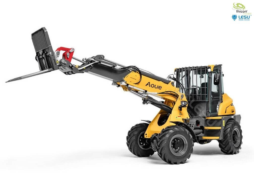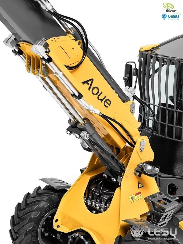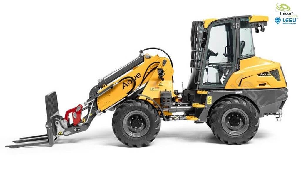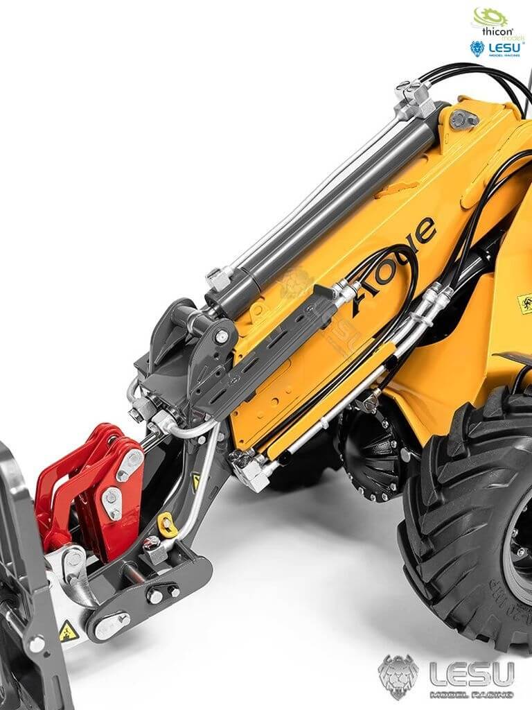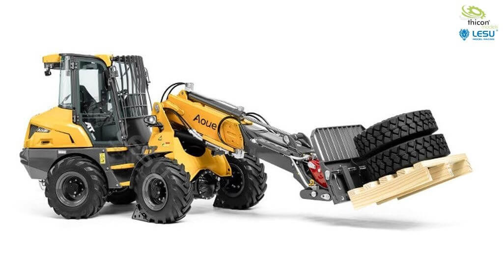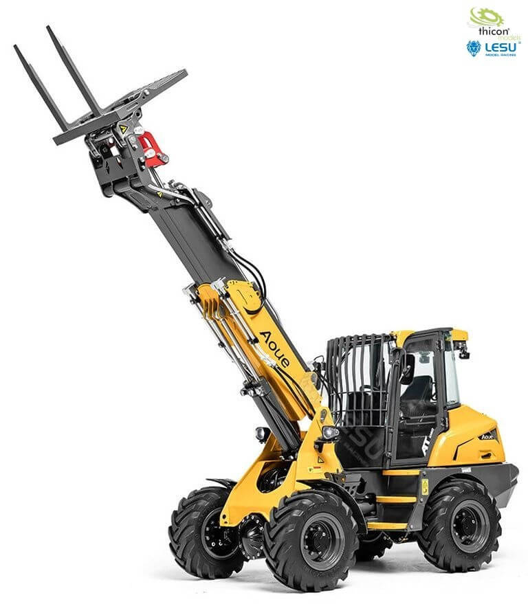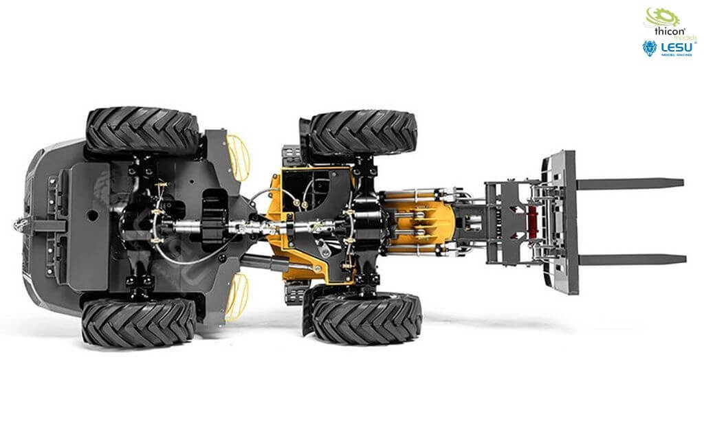 Modell fertig gebaut und lackiert mit FlySky ST8 Fernsteuerung inkl. Hydraulikzylinden, Brushlesspumpe, Servos und Fahrmotor mit Regler, Licht und Sound, Gabelschaufel.
