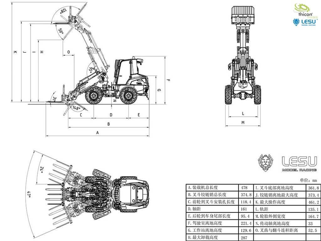 Länge: 478mm Breite: 164mm Höhe: 221mm Höhe Schaufel Unterkante: 361mm Lenkwinkel: 47° Gewicht: 3800g