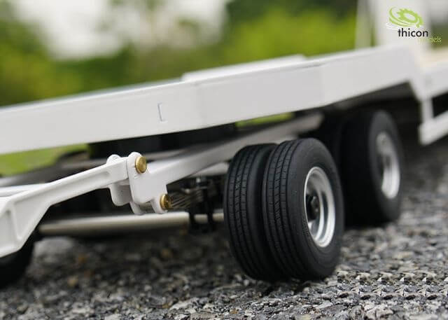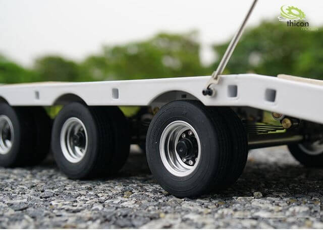 Tieflader-Anhänger mit 5 Achsen. Edel- stahl mattiert. Ready-to-Run. Fertig aufgebaut incl. Alufelgen mit Kugellagern.
