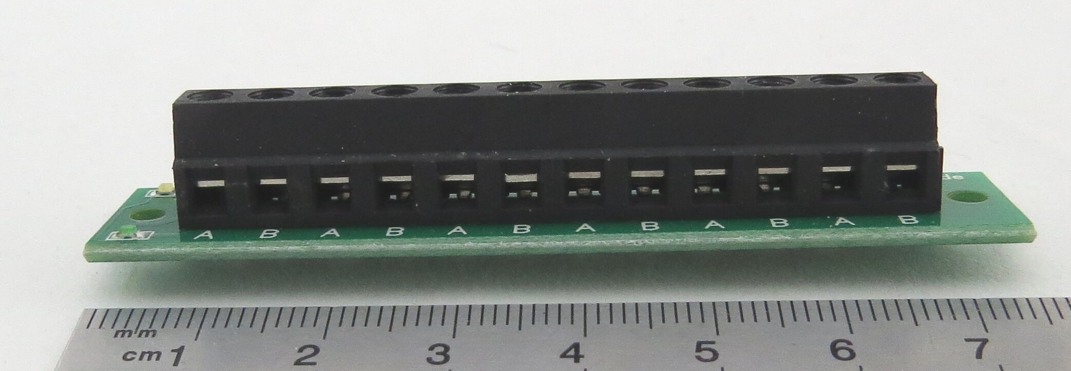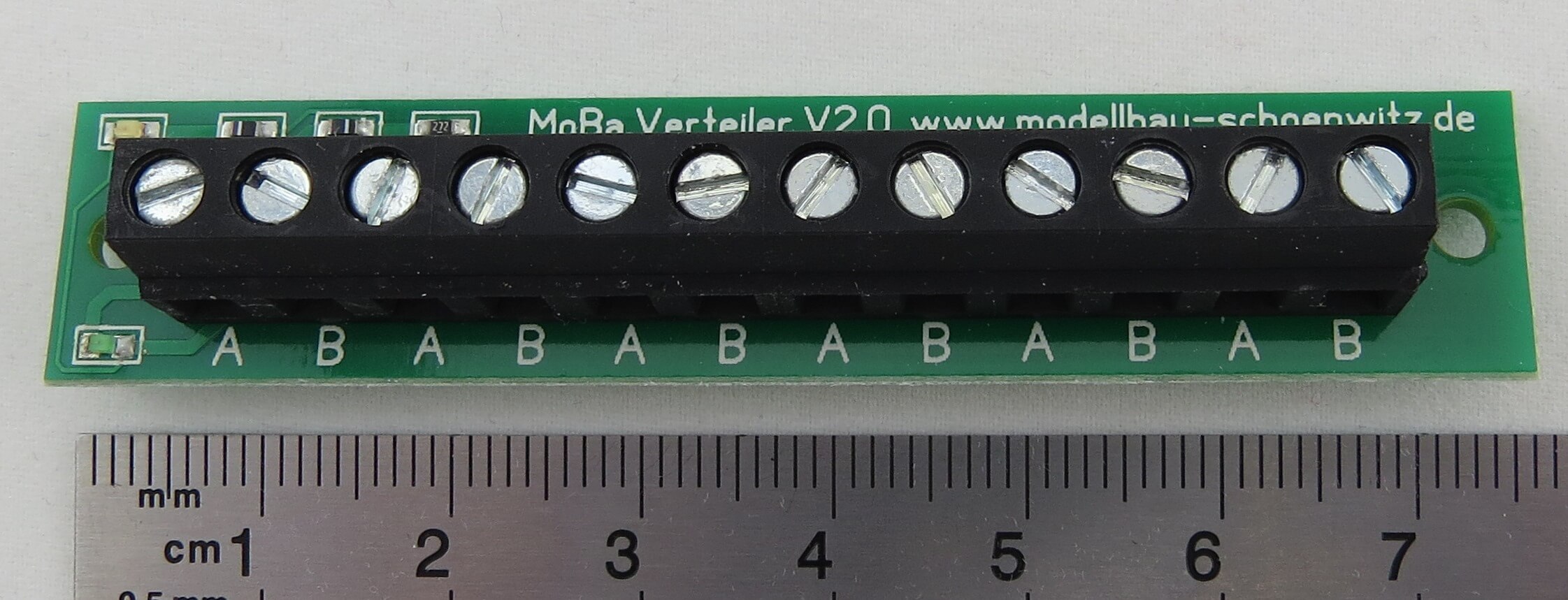 Verteiler-Platine bis 6A Gesamt-Belast- ung. Alle A-Anschlüße sind untereinander verbunden. Ebenso alle B-Anschlüße. 3 LEDs signalisieren die angelegte Spannung.