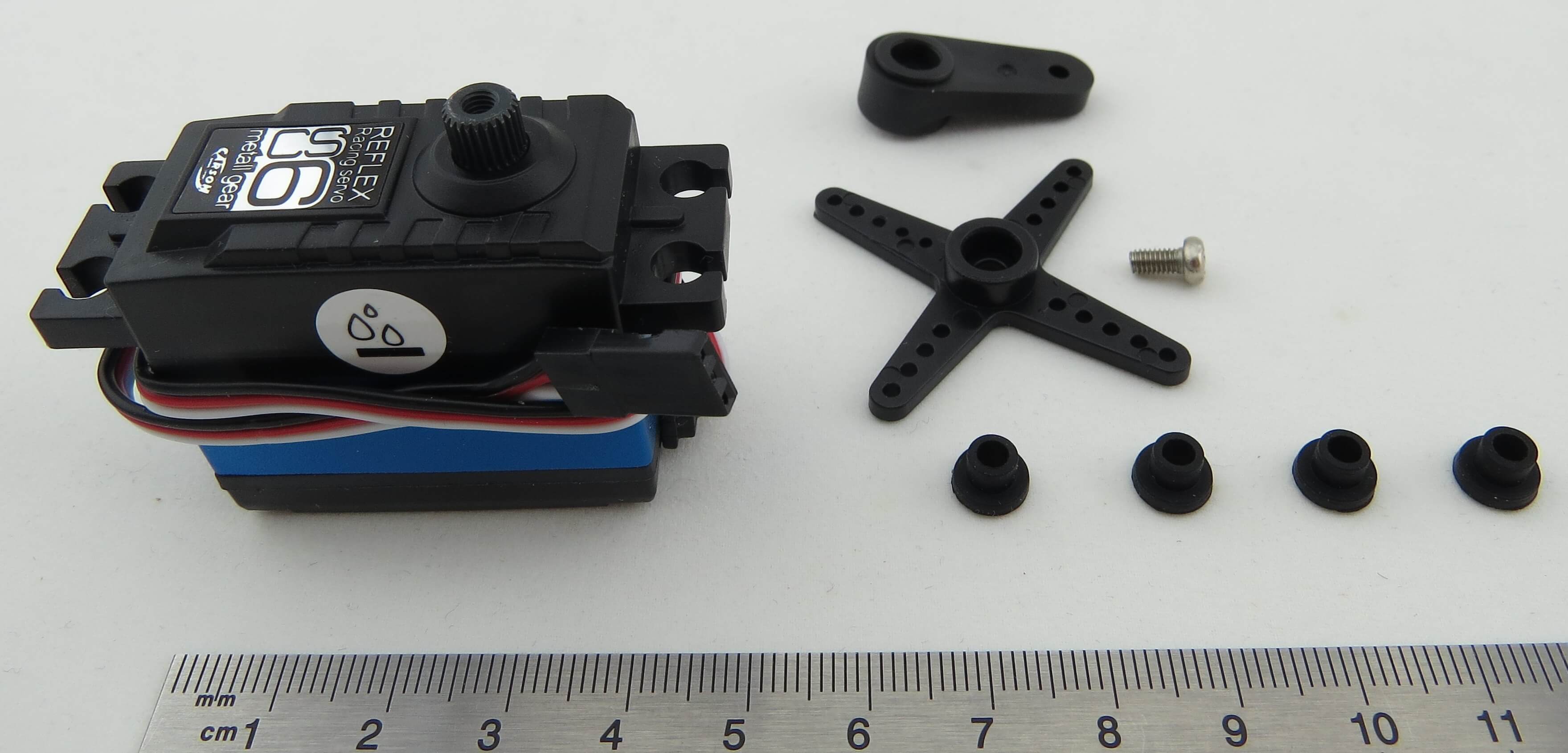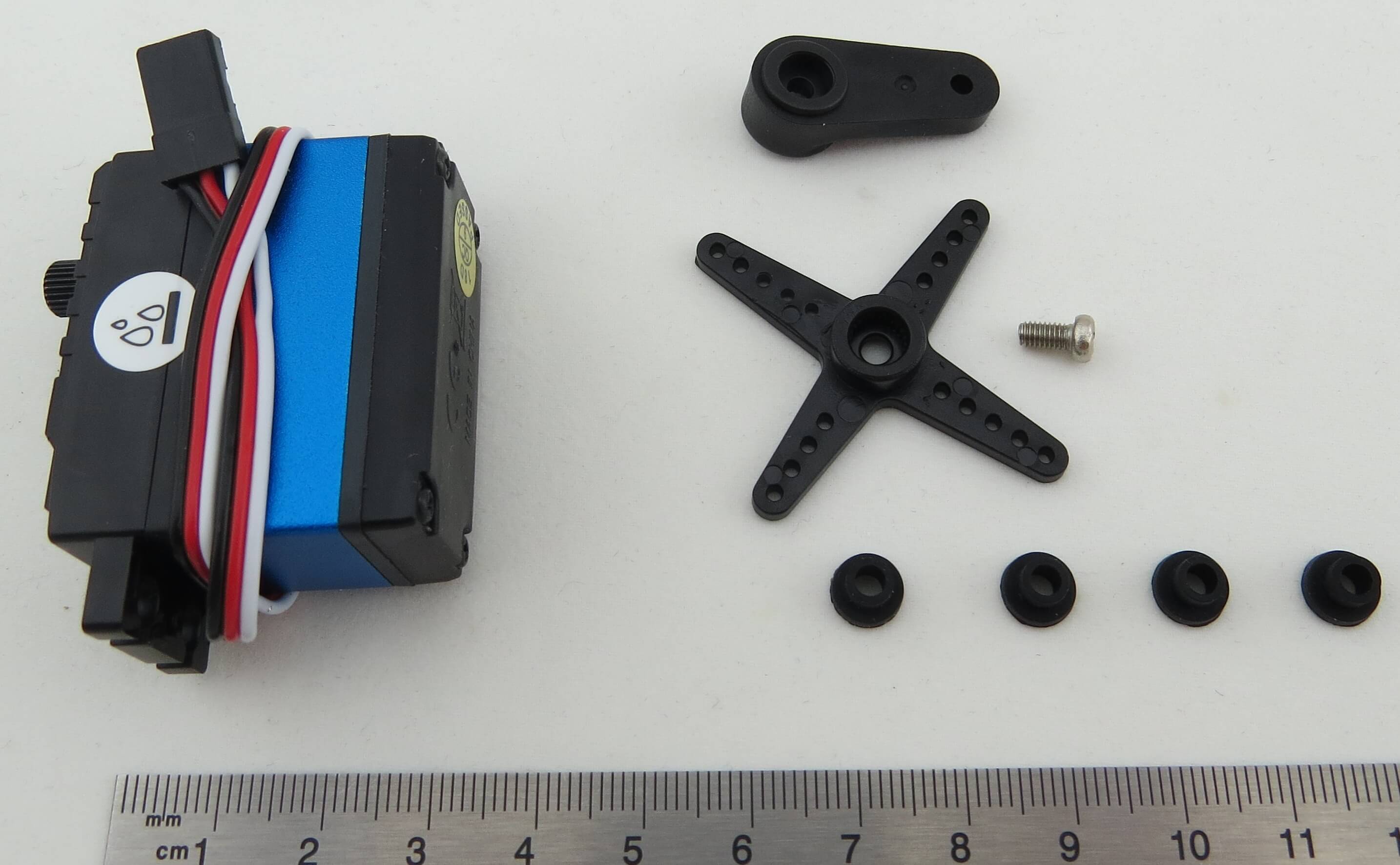 1x Waterproof-Servo CS-6MG m.JR-Stecker. Maße: 38,5x19x32mm. 4,8-6V Spannung. Stellmoment bei 6V: 60Ncm. Stellzeit ca. 0,2sec./60°. Gewicht 50 gr. Zubehör:Ruderhebel und Schrauben.