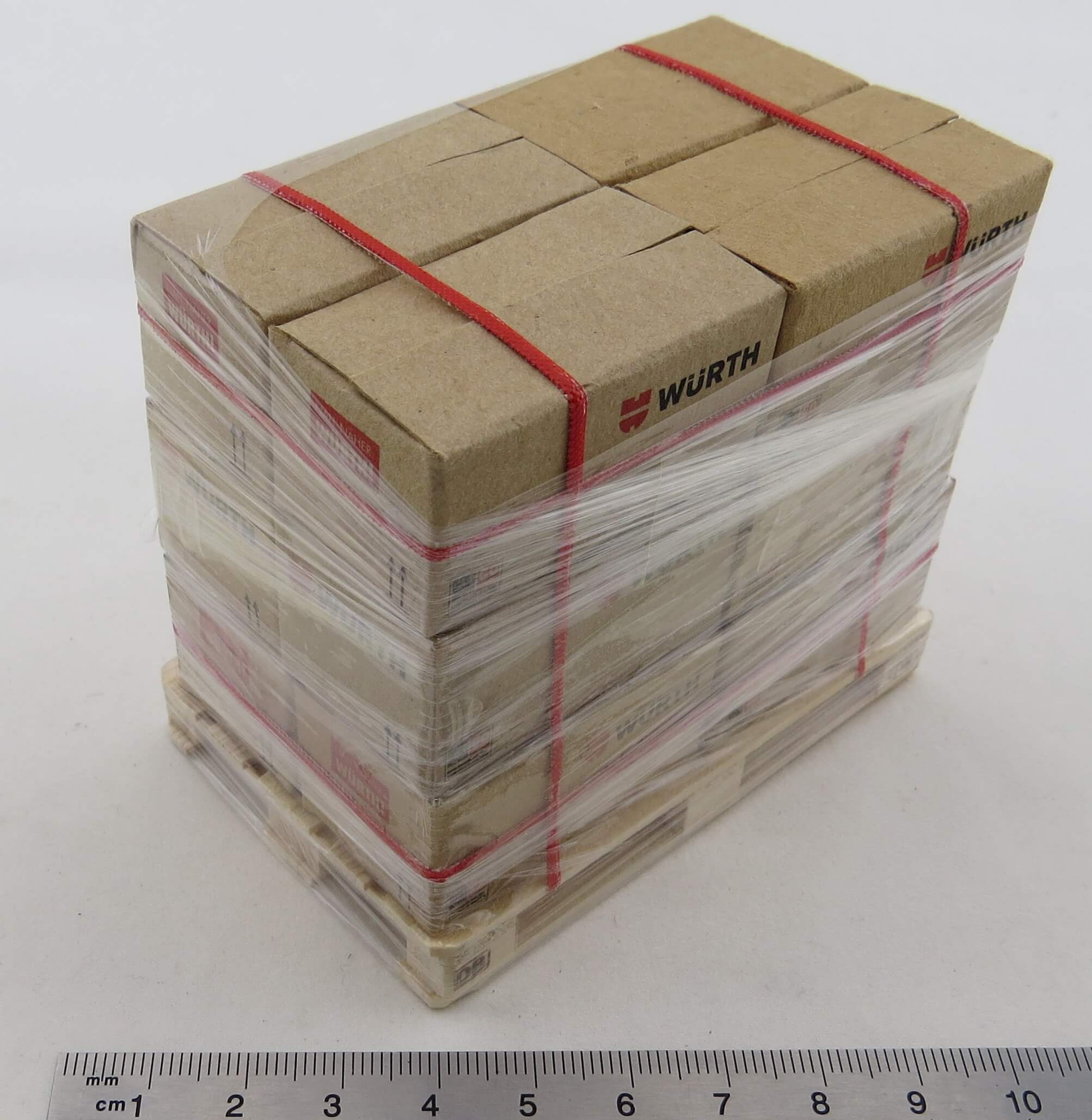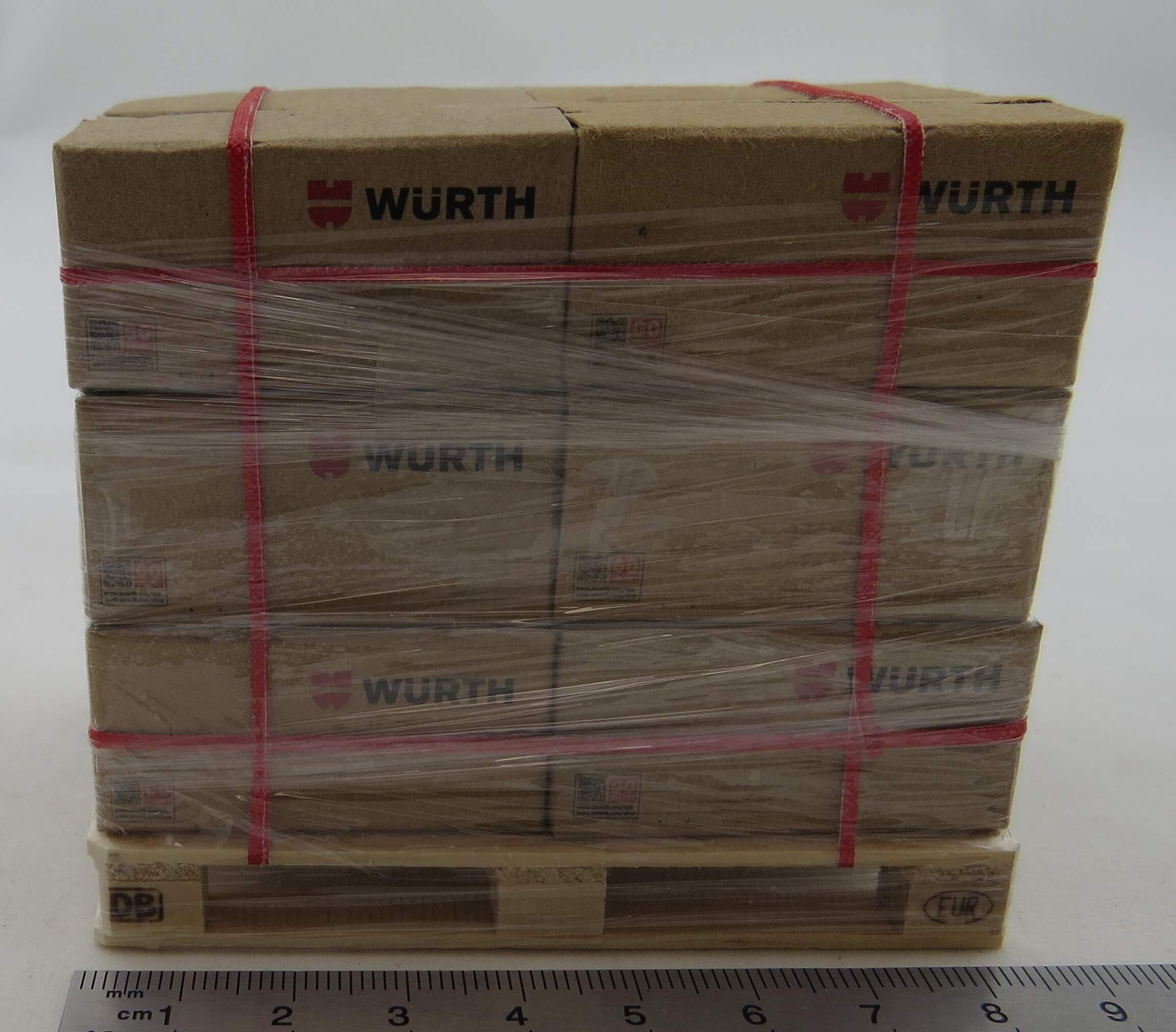 1 Würth Palettenkarton auf EURO-Palette. 1:14. Passend zum Tamiya-Maßstab. Echtholz-Palette mit 12 Kartons der Firma Würth. (lizensiert). Mit Spannbändern. 83 x 55 x 85mm.