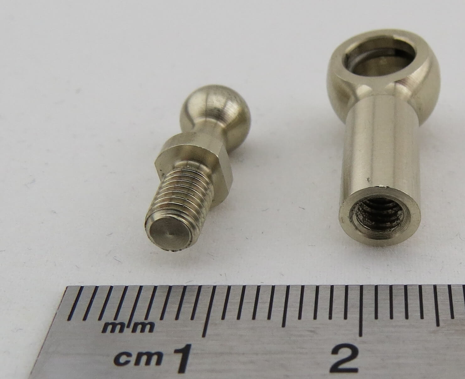 1x Winkelgelenk WG6 aus Neusilber. Kugeldurchmesser 6mm, Gewinde M4x7mm. Innengewinde M4 auf 7mm. Gesamtlänge 22mm. Mit Federring. Gewicht 6,6gr. Nahezu spielfrei.