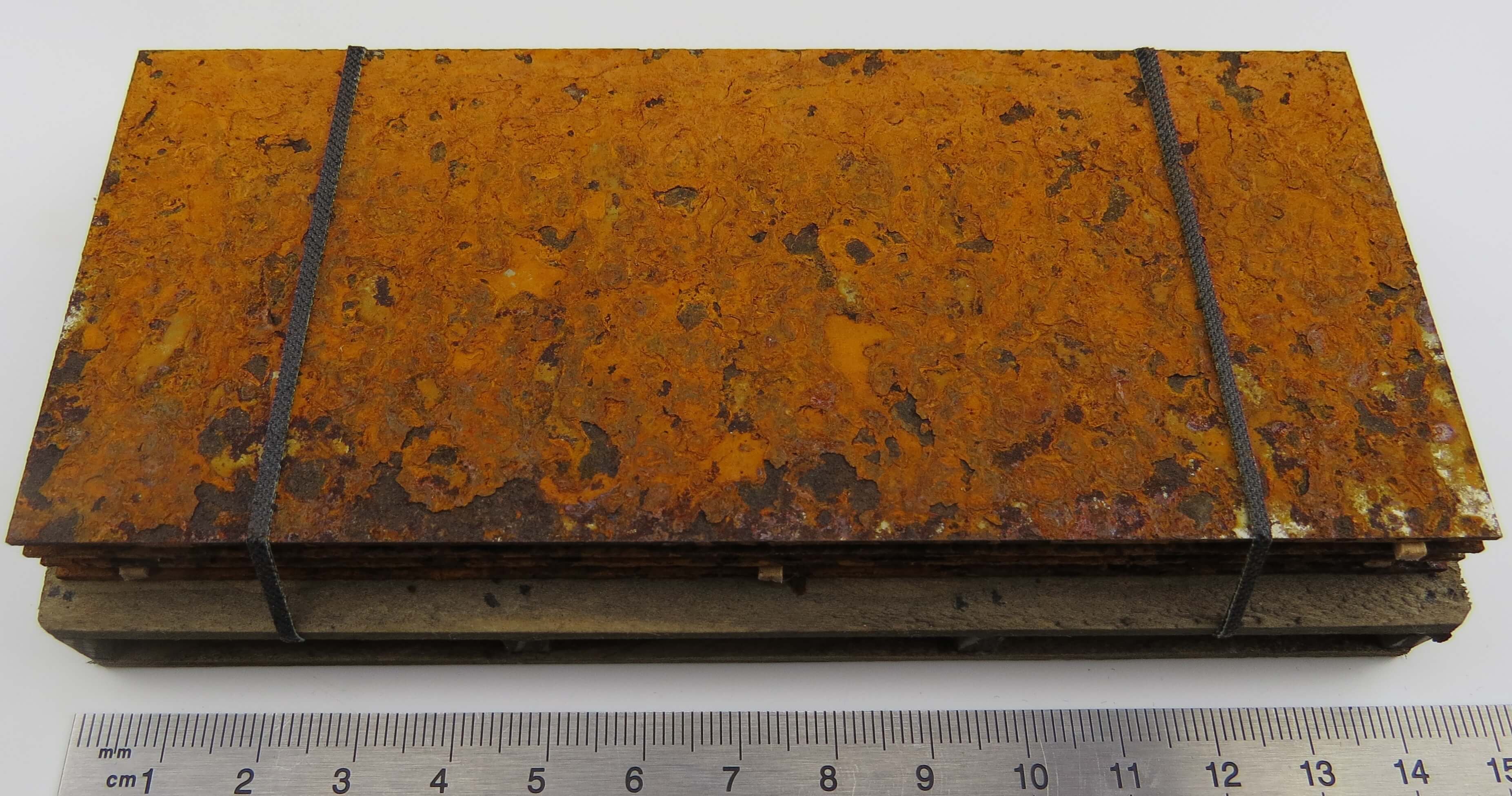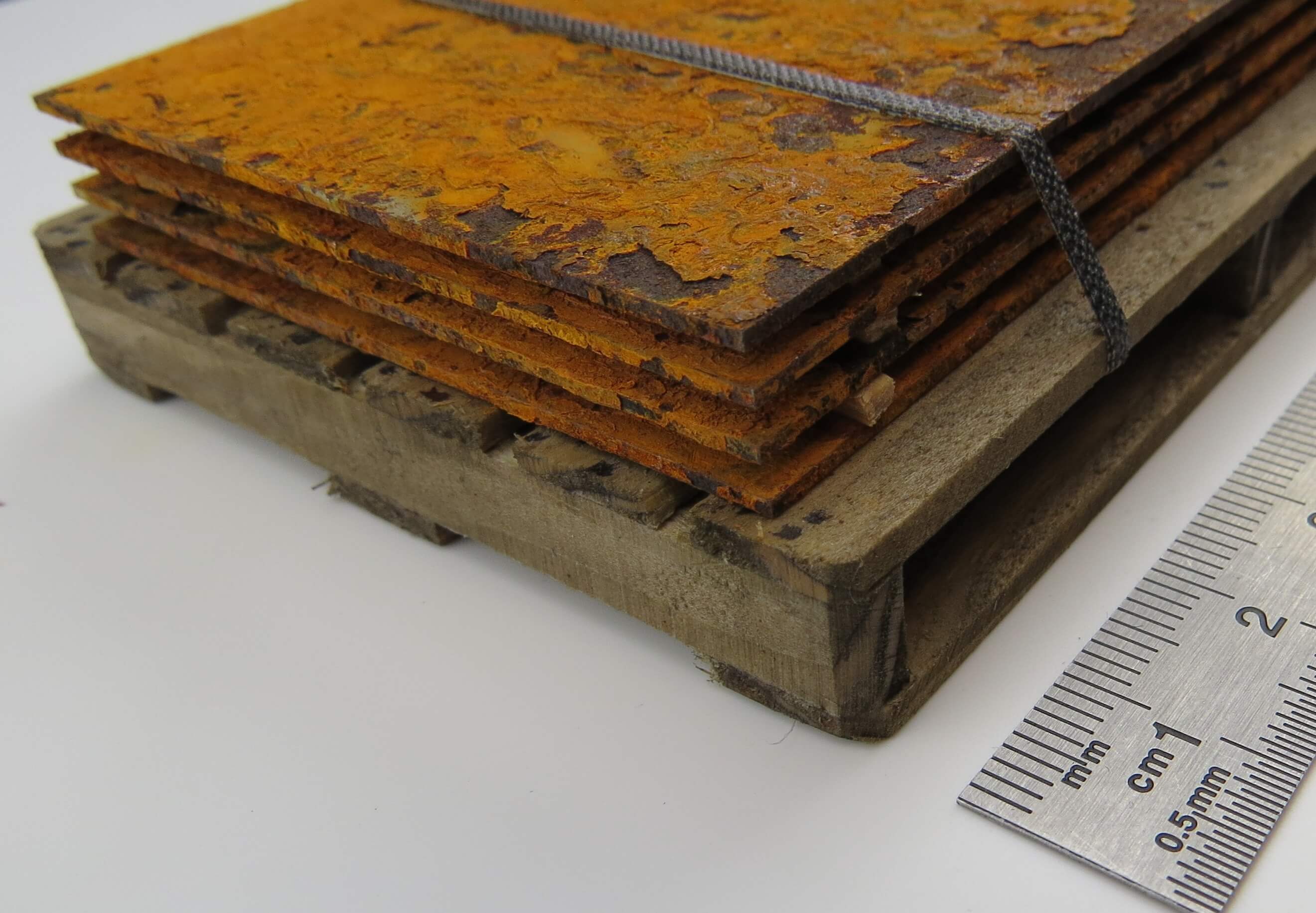 1 rostender Stahlplatten-Stapel auf Sonderpalette, für den Wedico-Maßstab. Maße: LxBxH 145x72x24mm. Gewicht ca. 290gr. Die Stahlplatten sind mit Zwisch- enlagen aufeinander gestapelt.
